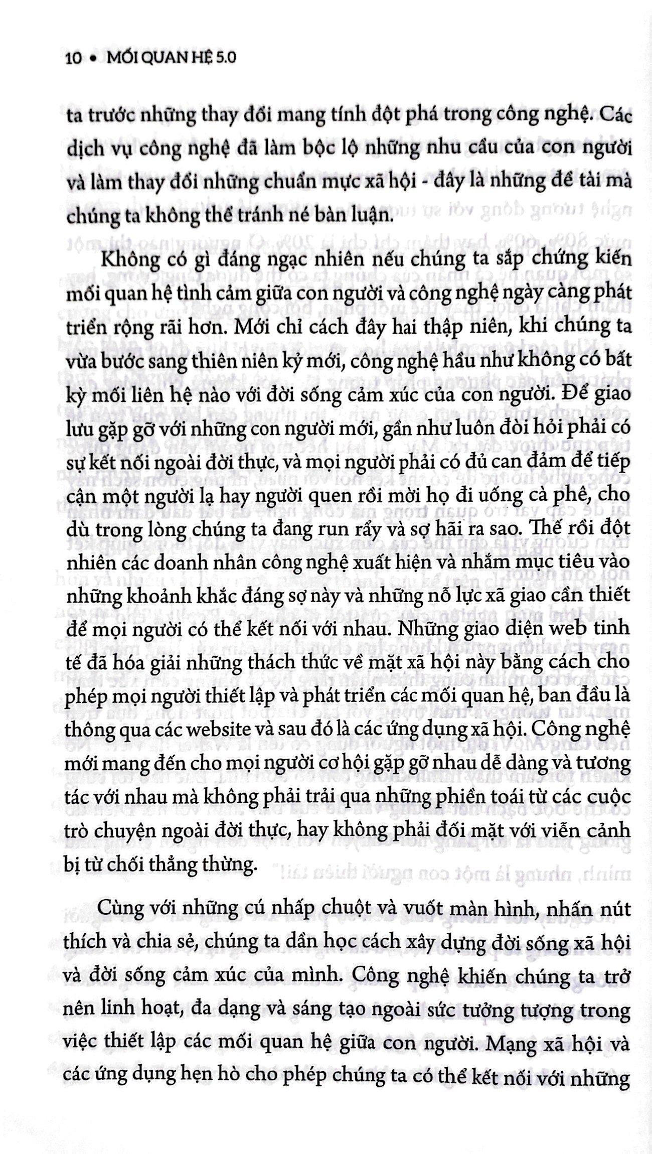 Mua tại TiktokTrong khi nhiều người vẫn lo ngại về tình bằng hữu giữa con người và công nghệ thì cuốn sách Mối quan hệ 5.0 tiết lộ rằng những sự kết nối mới mẻ này không nguy hiểm như chúng ta nghĩ, mà thay vào đó, có thể khiến đời sống xã hội và cảm xúc của chúng ta trở nên phong phú và đa dạng hơn. Song, chúng ta phải đặt câu hỏi: Thời đại của mối quan hệ 5.0 như thế nào? Chúng ta nên chuẩn bị như thế nào cho một thời đại như vậy? Ai đã sẵn sàng tận dụng những thay đổi này, và tại sao? Cuốn sách sẽ dẫn người đọc ra khỏi nỗi sợ hãi và đi vào một thực tại mới. Nó mở ra những câu hỏi cơ bản đằng sau những điều thiết yếu như tình bằng hữu, niềm tin, và tình yêu, đồng thời cung cấp những ý kiến thú vị và bất ngờ về tương lai trong những năm sắp tới. Mục lục Lời giới thiệu Chương 1: Lịch sử các mối quan hệ và công nghệ
