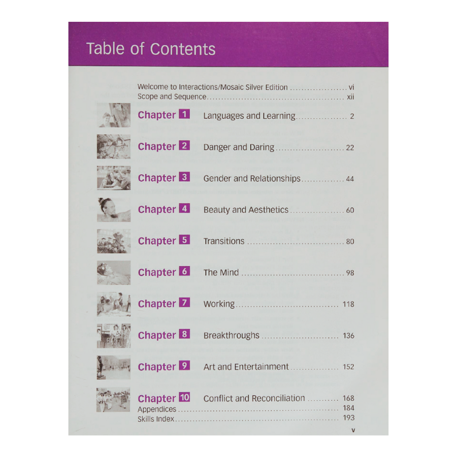 Interactions/Mosaic Silver Edition is a fully-integrated, 18-book, academic skills series. Language proficiencies are articulated from the beginning through advanced levels within each of the four language skill strands. Chapter themes articulate across the four strands to systematically recycle content, vocabulary, and grammar.