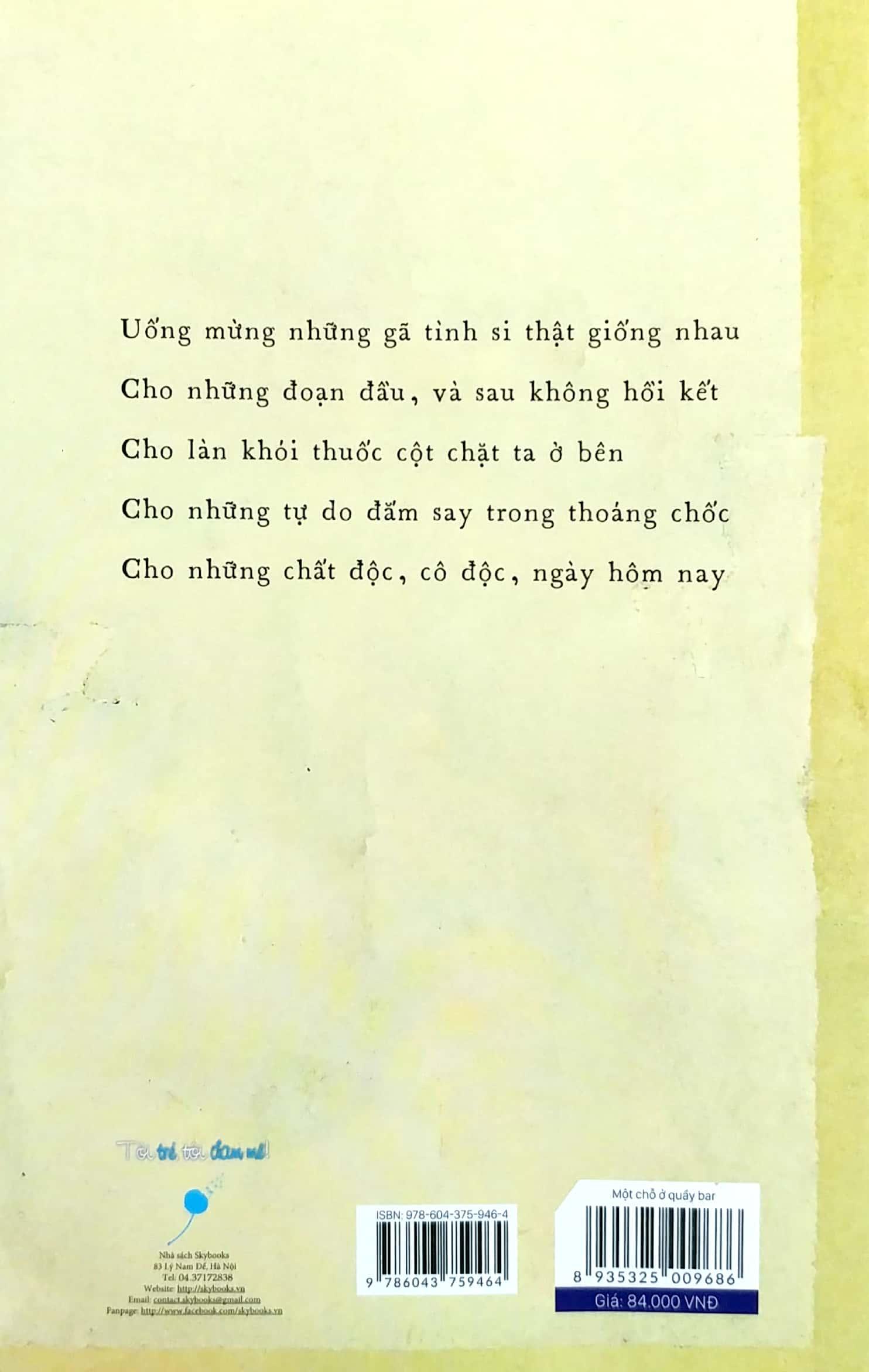 “Một chỗ ở quầy bar” còn chứa đựng các mẩu chuyện tình đậm nét hiện thực đơn giản đến ngỡ ngàng. Vẽ ra trước mắt bạn vài thời điểm trong cuộc đời, khi bạn đã học được cách quên một người từng yêu và rồi cũng bị xóa nhòa trong tâm trí họ.
