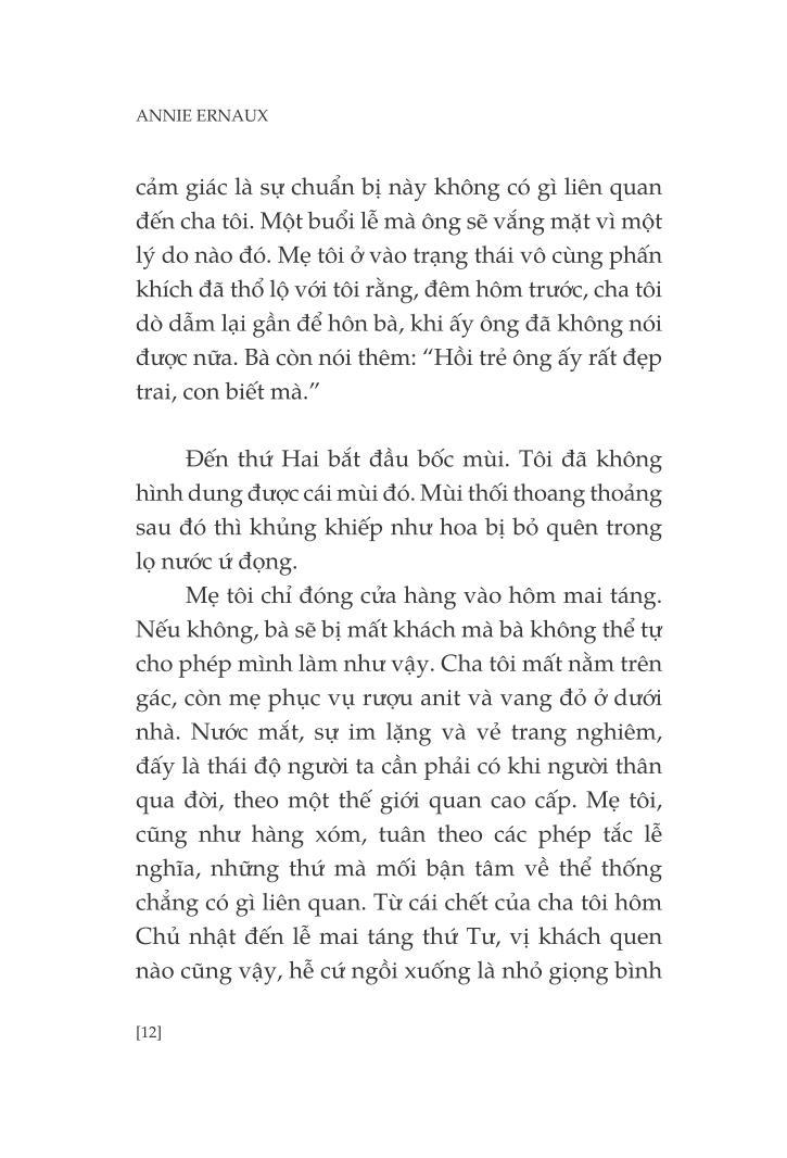 Một người cha không bao giờ bước chân vào viện bảo tàng, chỉ đọc báo địa phương, không dùng gì khác ngoài con dao Opinel của riêng mình để ăn. Một người cha xuất thân nông dân rồi trở thành công nhân và cuối cùng là chủ một tiệm cà phê kiêm cửa hàng tạp phẩm. Một người cha luôn lo lắng bị nhầm “vị trí”. Cũng người cha ấy lấy làm tự hào về cô con gái nhờ được học hành tử tế mà đã đặt chân được vào giới tiểu tư sản. Nhưng đằng sau đó là khoảng cách, là những đớn đau, giằn vặt giữa cha và con.