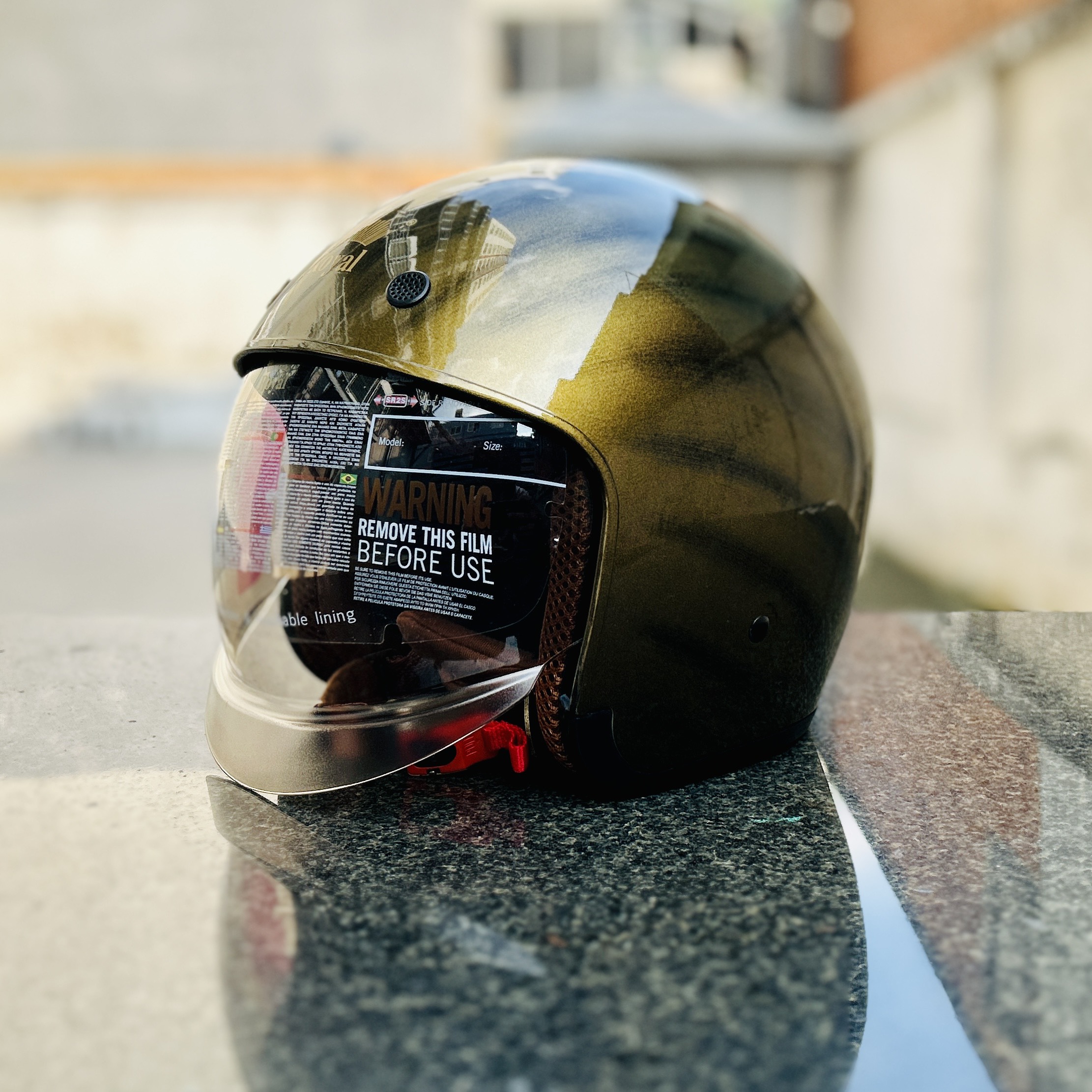 - Kính thẳng có 3 nút đồng gắn nón bảo hiểm - Có thể kéo mở lên xuống - Gắn chắc với các dòng nón Royal, Asia, Bulldog, Andes - Mặt kính đồng nhất, tầm