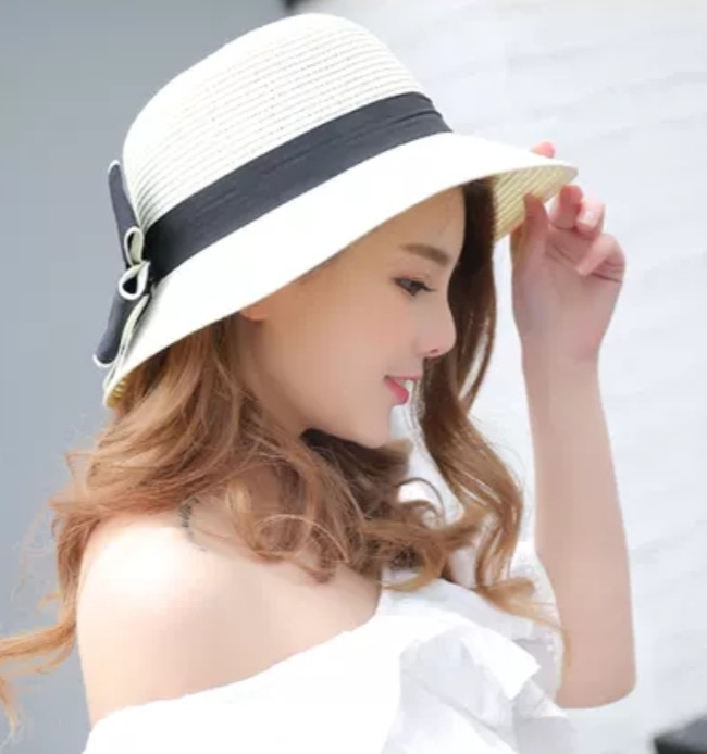 Mũ nón đi biển vành nhỏ chóp bằng phối đai trắng ngọc trai nhân tạo chất liệu cói chống nắng thoáng mát thời trang Hàn Quốc Chất liệu cói Kiểu dáng thời trang chống nắng