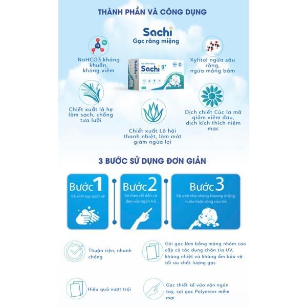 *GẠC RĂNG MIỆNG Gạc răng miệng Sachi có 3 đặc điểm chính: - Công thức ưu việt với chiết xuất Lá Hẹ, NaHCO3, NaCl, Xylitol, bổ sung chiết xuất Cúc La Mã & Lô Hội