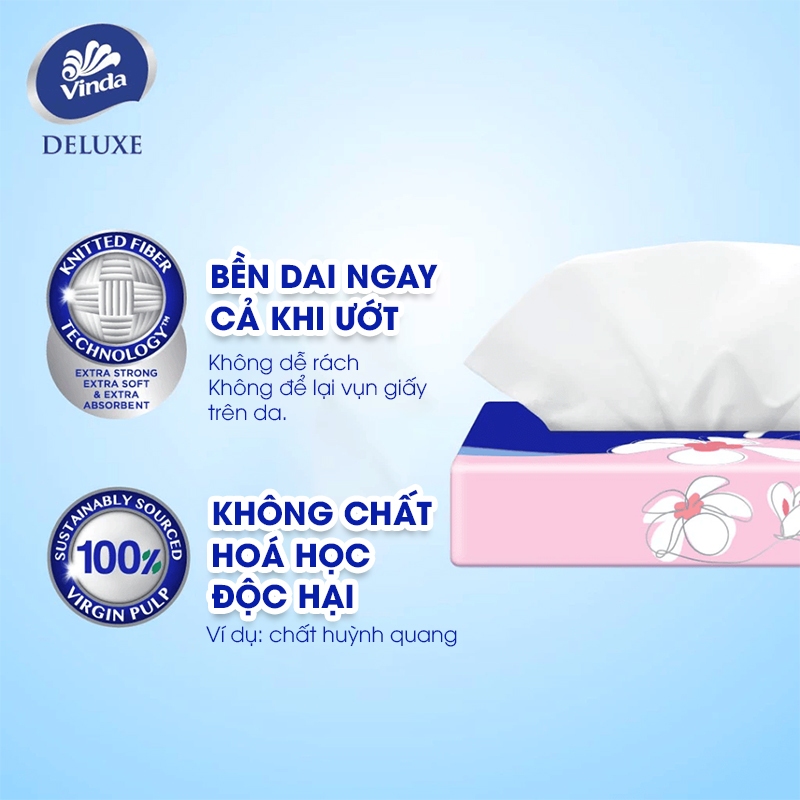 Câu chuyện thương hiệu:   Các gia đình Việt Nam đang ngày càng quan tâm sâu sắc hơn về các giải pháp chất lượng và an toàn dành cho toàn bộ mọi người trong gia đình đặc biệt là trẻ nhỏ. Họ mong muốn sản phẩm không chỉ hiệu quả mà còn mang đến chất lượng thoải mái để họ có thể yên tâm về sức khỏe cũng như sự an toàn cho các thành viên trong gia đình. Vinda thấu hiểu sâu sắc và luôn nỗ lực để đáp ứng yêu cầu thích đáng của khách hàng.  Vinda mong muốn trở thành một phần không thể thiếu trong các hoạt động thường nhật của gia đình bạn. Khăn giấy Vinda sẽ mang đến sự hiệu quả cũng giống như sự bền dai vượt trội ngay cả khi ướt thông qua công nghệ Knitted Fiber chuyên biệt, qua đó, để các gia đình luôn cảm giác an tâm và thoải mái trong mọi khoảnh khắc.   Giới thiệu sản phẩm:   Khăn giấy rút Vinda được làm từ bột giấy nguyên chất, không chứa hóa chất tẩy trắng độc hại, an toàn cho sức khỏe người dùng. Sản phẩm Vinda bền dai ngay cả khi ướt, không để lại vụn giấy khi sử dụng Thiết kế dạng rút tiện lợi giúp lấy giấy dễ dàng, hợp vệ sinh, phù hợp sử dụng trong gia đình, văn phòng, nhà hàng, trường học hoặc mang theo khi di chuyển. Phù hợp lý tưởng để vệ sinh cá nhân như lau tay, lau mặt, hoặc vệ sinh vật dụng cá nhân, bàn ăn hay các bề mặt khác. Ngoài ra, sản phẩm cũng thích hợp dùng trong các bữa ăn, đảm bảo an toàn thực phẩm và mang lại cảm giác sạch sẽ, dễ chịu.   Hạn sử dụng và quy cách: Hạn sử dụng: 3 năm kể từ ngày sản xuất. Ngày sản xuất: in trên gói theo năm/tháng/ngày   Quy cách:  Khăn giấy rút cao cấp Vinda Deluxe Size S Số lượng: 50 tờ 1 gói Số lớp: 3 lớp/ tờ Định lượng của 1 lớp giấy: 14 ± 1,0 gsm Kích thước: (140mm x 195mm) ± 5 mm Thành phần: 100% Bột giấy nguyên thủy. Bảo quản: Để nơi thoáng mát và tránh ánh nắng mặt trời