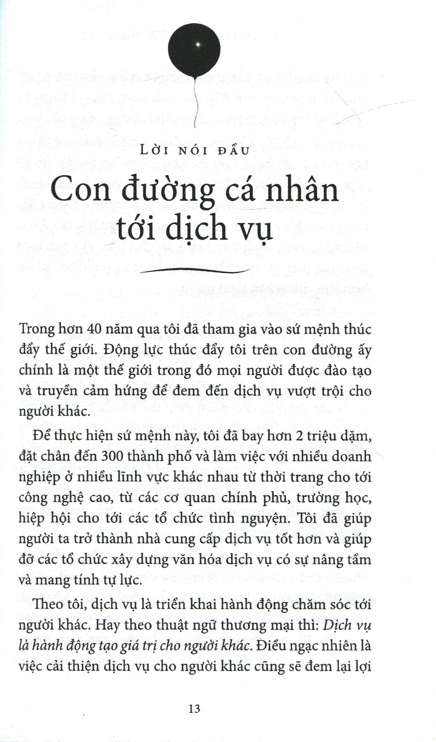Mua tại TiktokCuốn sách tiết lộ sức mạnh của việc cung cấp dịch vụ nâng tầm và các bước đi mà người làm dịch vụ có thể áp dụng nhằm xây dựng văn hóa dịch vụ bền vững, có thể phát huy hiệu quả hàng ngày. Cuốn sách cũng trả lời rất nhiều câu hỏi về quá trình thúc đẩy dịch vụ liên tục và xóa đi những quan niệm sai lầm về dịch vụ. Cuốn sách sẽ làm nổi bật lên các công ty và những con người luôn đặt ưu tiên vào sự phục vụ, và có được những thành quả và danh tiếng tuyệt vời. Cuốn sách đưa ra những vấn đề cốt yếu cần thiết để bắt đầu thúc đẩy tổ chức kinh doanh dịch vụ – và tầm nhìn của lãnh đạo kinh doanh dịch vụ.