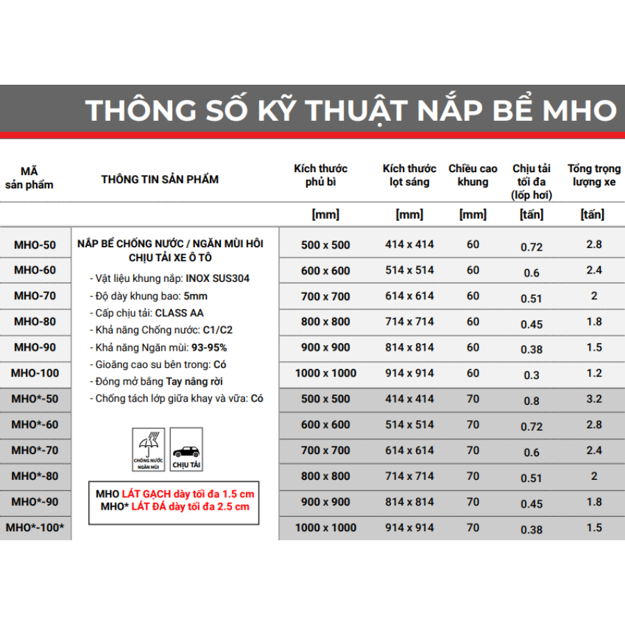 - Cấp chịu tải CLASS A (ZAVAK): 0.6 tấn/nắp, chịu tải cho xe 2.4 tấn.