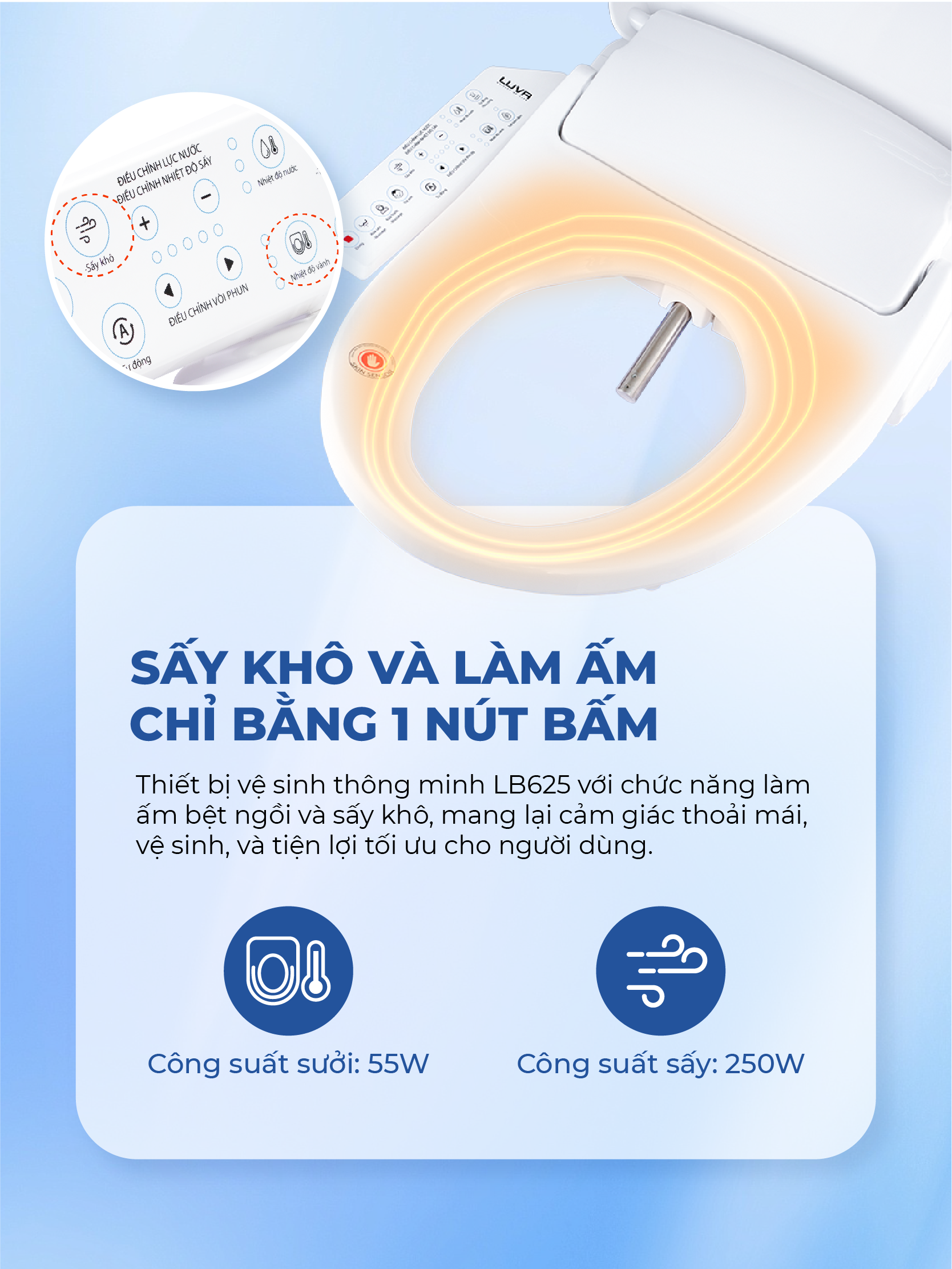 Nắp bồn cầu điện tử LUVA Bidet LB625: nhiều chức năng, có luôn sấy nóng