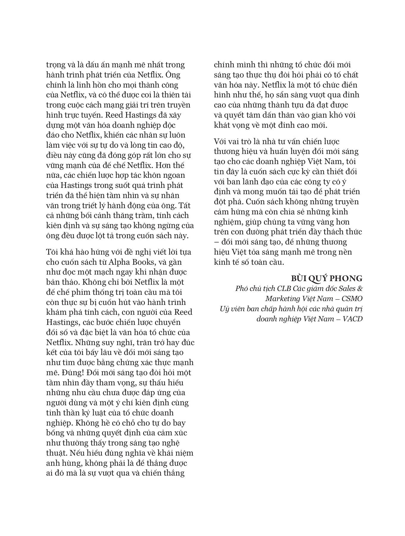 Cuốn sách trình bày tiểu sử ngắn gọn nhưng chi tiết cung cấp một cái nhìn tổng thể về quỹ đạo sự nghiệp của Hastings. Từ phong cách quản lý độc đáo của ông đến những sai lầm lớn nhất mà đã mắc phải trong suốt chặng đường xây dựng Netflix, rồi đến những lý do đằng sau quyết định đưa Netflix từ một công ty kinh doanh sản phẩm (DVD cho thuê) thành một công ty công nghệ tập trung vào phát trực tuyến, Burgess làm sáng tỏ Hastings “thành công và hướng tới những gì tương lai có thể mang lại cho ông và các dự án kinh doanh của ông.