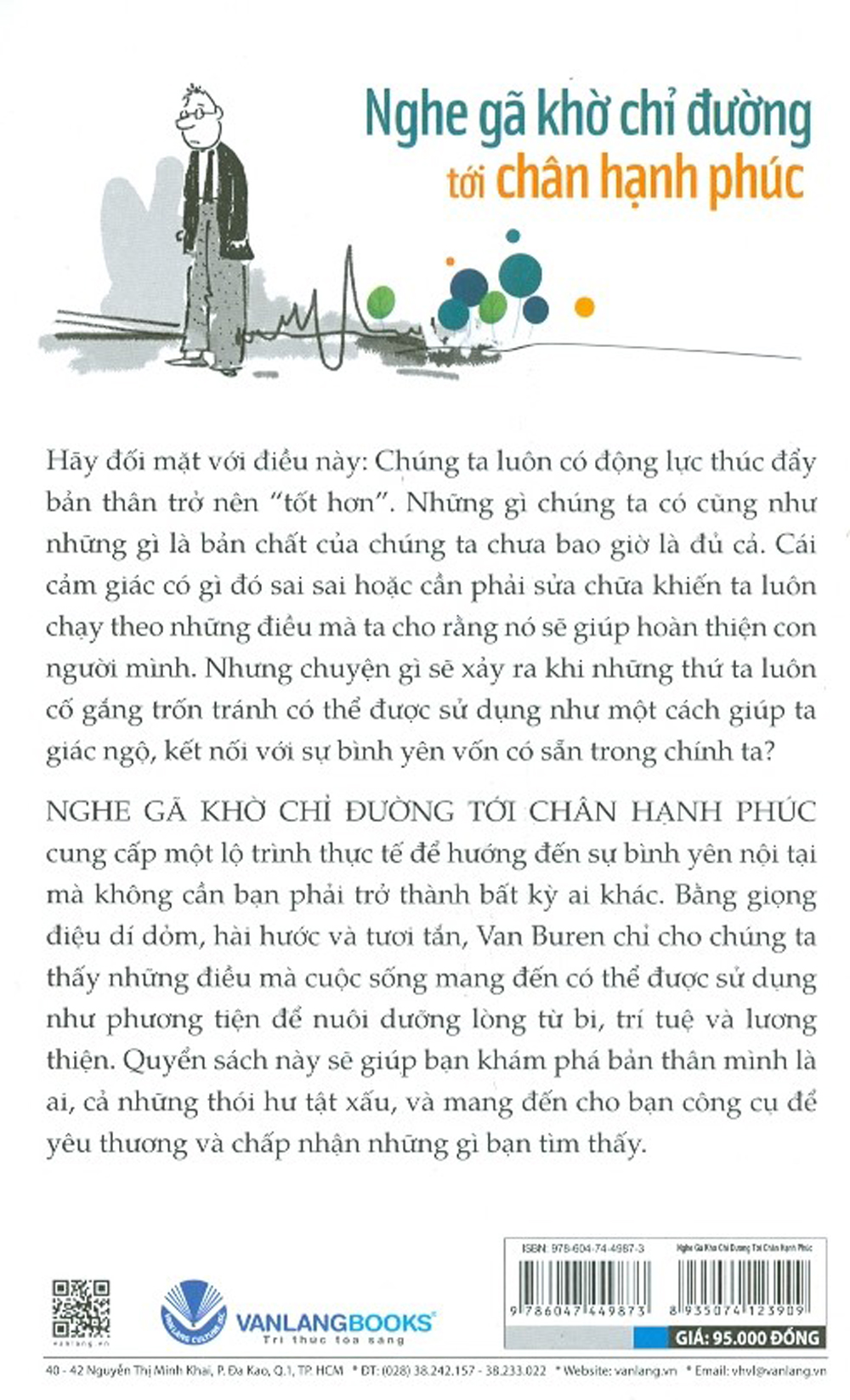 NGHE GÃ KHỜ CHỈ ĐƯỜNG TỚI CHÂN HẠNH PHÚC cung cấp một lộ trình thực tế để hướng đến sự bình yên nội tại mà không cần bạn phải trở thành bất kỳ ai khác. Bằng giọng điệu dí dỏm, hài hước và tươi tắn, Van Buren chỉ cho chúng ta thấy những điều mà cuộc sống mang đến có thể được sử dụng như phương tiện để nuôi dưỡng lòng từ bi, trí tuệ và lương thiện. Quyển sách này sẽ giúp bạn khám phá bản thân mình là ai, cả những thói hư tật xấu, và mang đến cho bạn công cụ để yêu thương và chấp nhận những gì bạn tìm thấy.