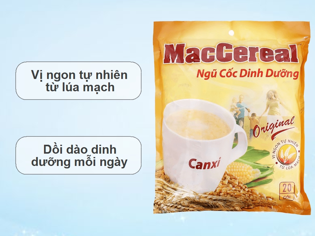 Đôi nét về thương hiệu Thương hiệu MacCereal được ra đời vào khoảng năm 1994, đây là thương hiệu Việt Nam với các sản phẩm ngũ cốc được người tiêu dùng đánh giá cao. Sản phẩm được sản xuất từ các thành phần chất lượng, dây chuyền sản xuất hiện đại và không ngừng phát triển tạo nên các sản phẩm về ngũ cốc thơm ngon, tốt cho sức khỏe người tiêu dùng. Ngũ cốc dinh dưỡng Maccereal Canxi với thành phần chính là ngũ cốc, lúa mì, lúa mạch, bắp giúp cung cấp dinh dưỡng cần thiết cho cơ thể. Bổ sung hàm lượng canxi cao giúp phát triển khung xương và hỗ trợ ngăn ngừa loãng xương hiệu quả. Thành phần dinh dưỡng trong sản phẩm Với công thức đặc biệt ít calo, ít chất béo, nhiều chất xơ, giúp bạn kiểm soát cân nặng một cách hiệu quả mang lại cho bạn một cơ thể khỏe mạnh và một vóc dáng thon thả, như ý. Cụ thể trong sản phẩm có chứa các chất đạm, canxi, chất xơ, các vitamin và khoáng chất khác. Ngoài ra đây còn là nguồn bổ sung năng lượng dồi dào cho cơ thể. Trong 28g (một gói nhỏ) sản phẩm sẽ cung cấp cho cơ thể khoảng 120 kcal. Tác dụng của sản phẩm với sức khỏe Một số tác dụng nổi bật của sản phẩm đối với sức khỏe như: