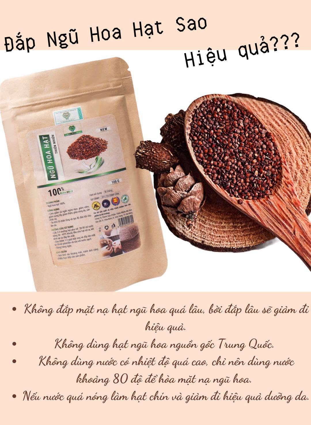 NGŨ HOA HẠT MẸ KEN Ngũ hoa hạt là khắc tinh của mụn nhọt, giúp loại bỏ mụn một cách nhanh chóng, an toàn, đồng thời dưỡng da mịn màng và căng sáng hơn. CÔNG DỤNG:  Se khít lỗ chân lông, giảm lượng dầu dư thừa trên da, hỗ trợ điều trị các loại mụn, thậm chí là mụn lâu năm.  Làm mờ thâm do mụn, nám, tàn nhang  Tăng độ đàn hồi cho da, giúp da căng bóng và mịn màng. Giảm cơn đau đầu, chóng mặt CÁCH SỬ DỤNG NGŨ HOA HẠT ĐỂ HỖ TRỢ ĐIỀU TRỊ MỤN: Chỉ cần lấy khoảng 2 thìa ngũ hoa hạt, trộn với 20-30ml nước ấm khấy đầu để hạt nở ra thành hỗn hợp sệt, có thể cho thêm ít giọt mật ong vào sau đó đắp lên mặt và thư giãn trong khoảng 30-60 phút, đến khi mặt nạ gần khô thì rửa sạch với nước. Kiên trì thực hiện sẽ thấy tình trạng mụn cải thiện, da sáng và mịn màng hơn. ĐẮP TUẦN 1-2 LẦN THƯ GIÃN DA HOẶC CÓ THỂ ĐẮP MỖI NGÀY ĐỂ DA ĐẸP MỊN LÊN TRÔNG THẤY KẾT NHỚ HỢP TẨY DA CHẾT CHO MẶT NHA CHỊ EM