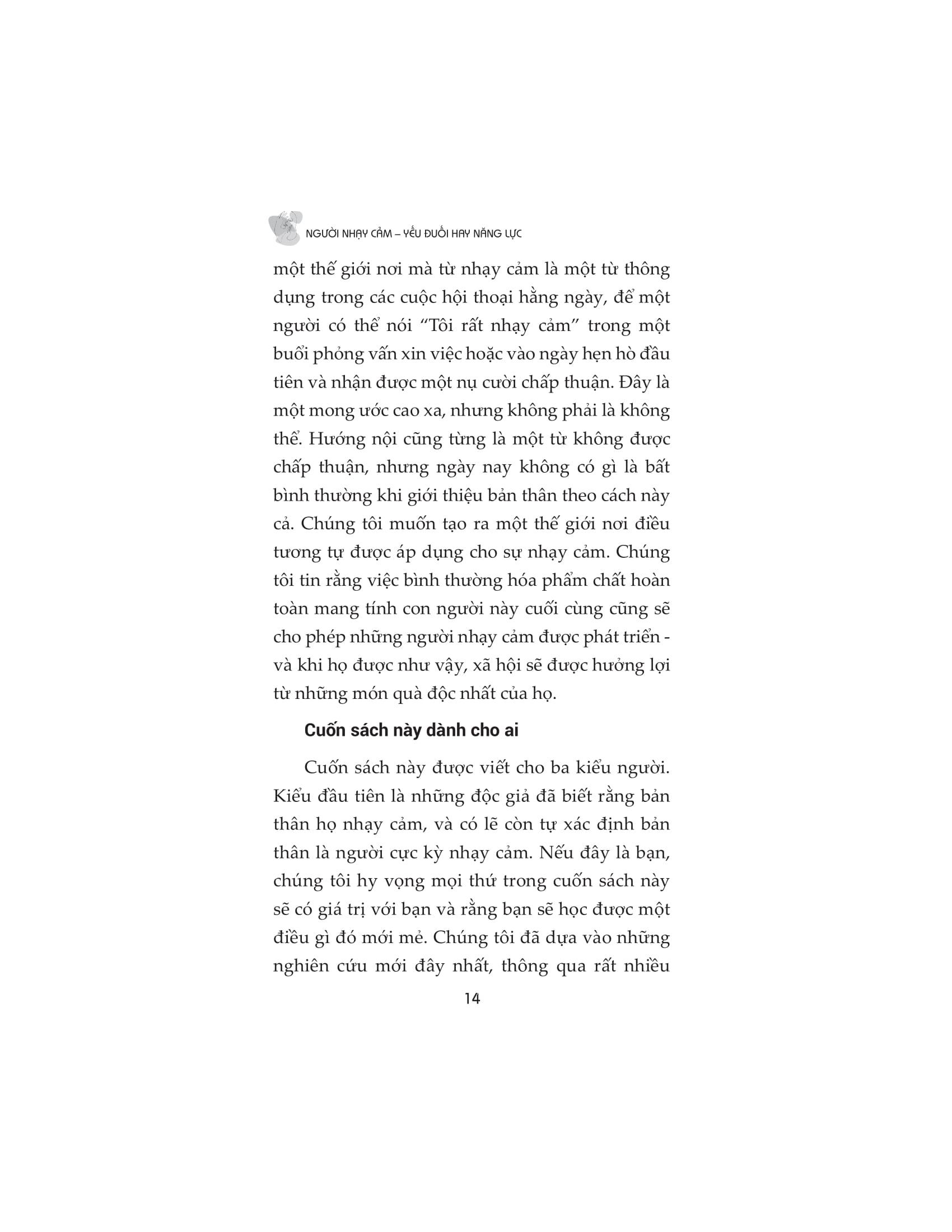 Người nhạy cảm đều có quyền lựa chọn con đường riêng của họ. Nhưng có một bước mà tất cả chúng ta đều phải thực hiện và nó là bước khó khăn nhất: ngưng nhìn nhận sự nhạy cảm là một khiếm khuyết và bắt đầu coi nó là một món quà. Cuốn sách chứa đầy cảm hứng này sẽ thay đổi mãi mãi cách chúng ta nhìn nhận những người nhạy cảm và cách họ nhìn nhận chính m.ình.