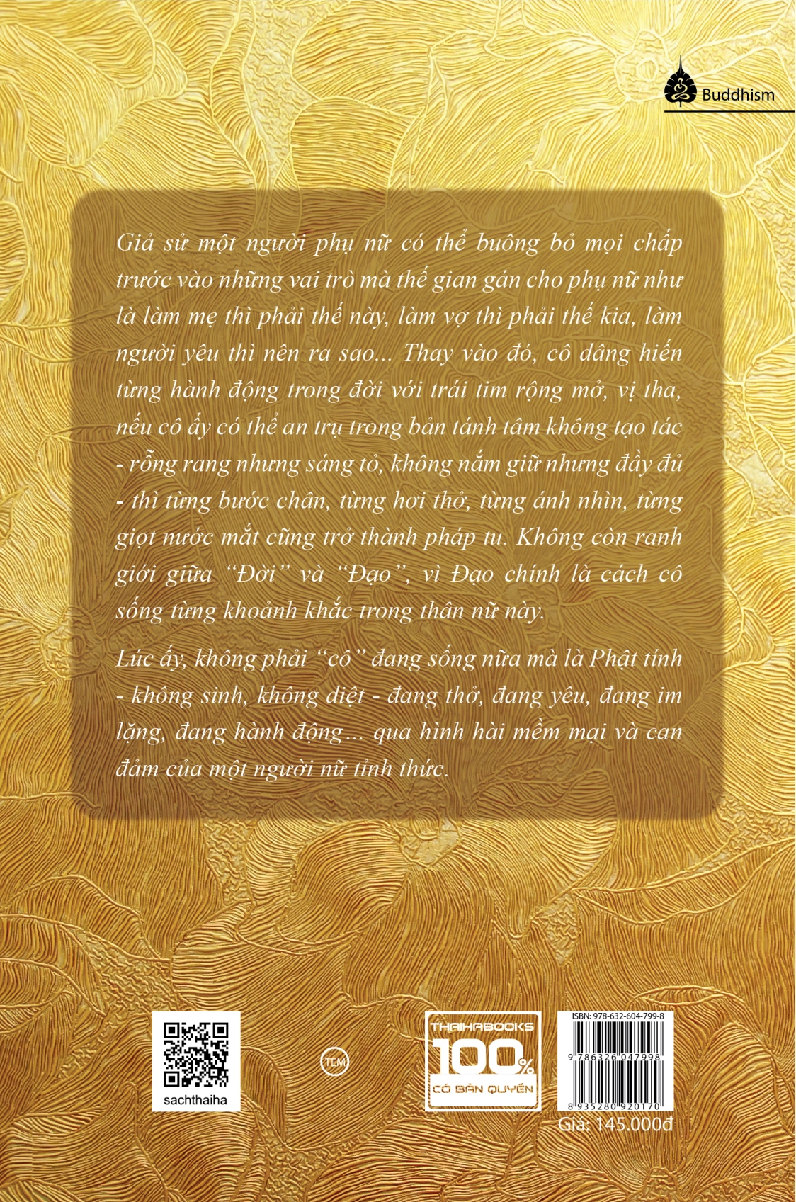 Giả sử một người phụ nữ có thể buông bỏ mọi chấp trước vào những vai trò mà thế gian gán cho phụ nữ như là làm mẹ thì phải thế này, làm vợ thì phải thế kia, làm người yêu thì nên ra sao... Thay vào đó, cô dâng hiến từng hành động trong đời với trái tim rộng mở, vị tha, nếu cô ấy có thể an trụ trong bản tánh tâm không tạo tác - rỗng rang nhưng sáng tỏ, không nắm giữ nhưng đầy đủ - thì từng bước chân, từng hơi thở, từng ánh nhìn, từng giọt nước mắt cũng trở thành pháp tu. Không còn ranh giới giữa “Đời” và “Đạo”, vì Đạo chính là cách cô sống từng khoảnh khắc trong thân nữ này. Lúc ấy, không phải “cô” đang sống nữa mà là Phật tính - không sinh, không diệt - đang thở, đang yêu, đang im lặng, đang hành động… qua hình hài mềm mại và can đảm của một người nữ tỉnh thức.