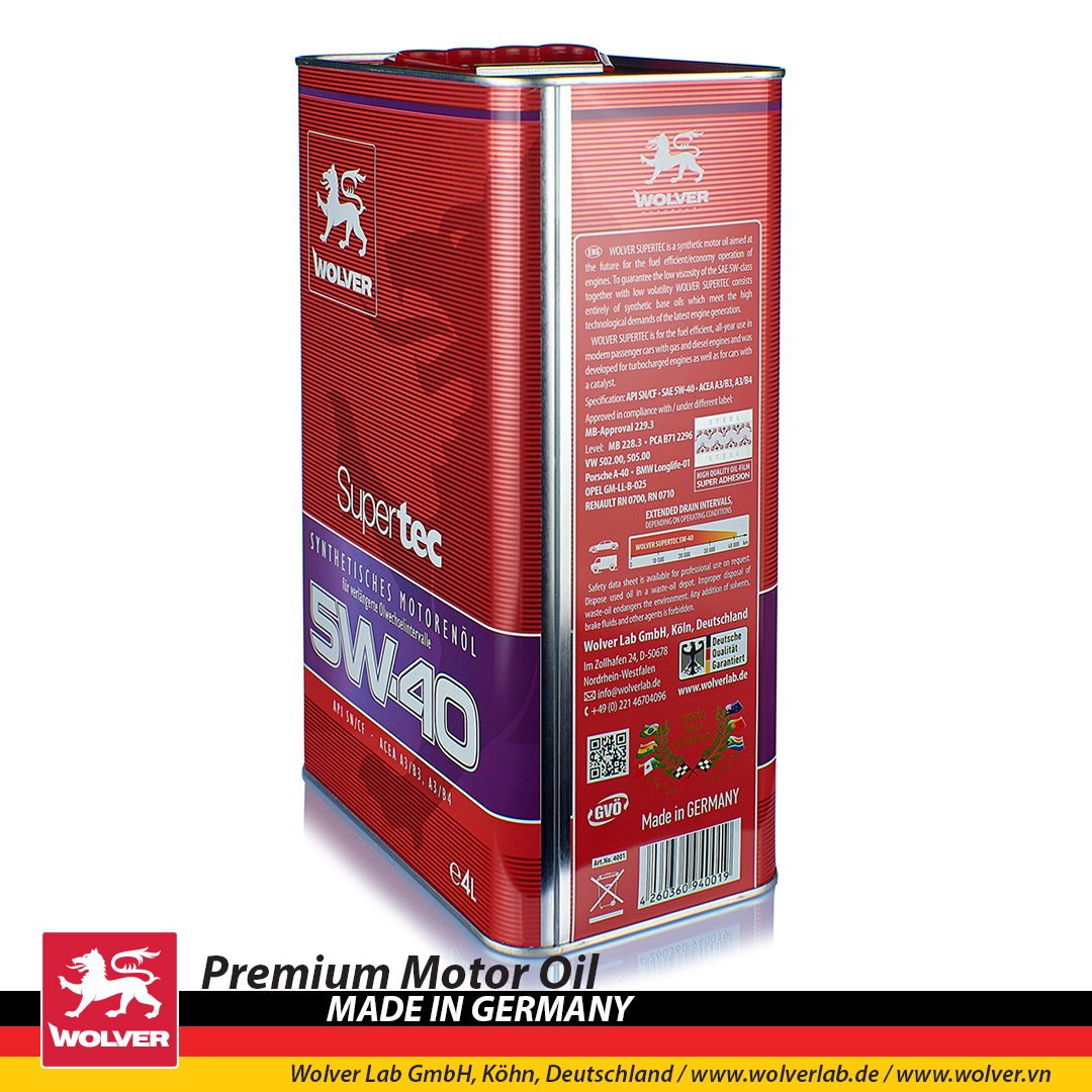 WOLVER SuperTec SAE 5W-40 là dầu động cơ tổng hợp với hệ phụ gia tiên tiến đúc kết từ những thành tựu R&D và những nỗ lực cải tiến chất lượng liên tục của Wolverlab.