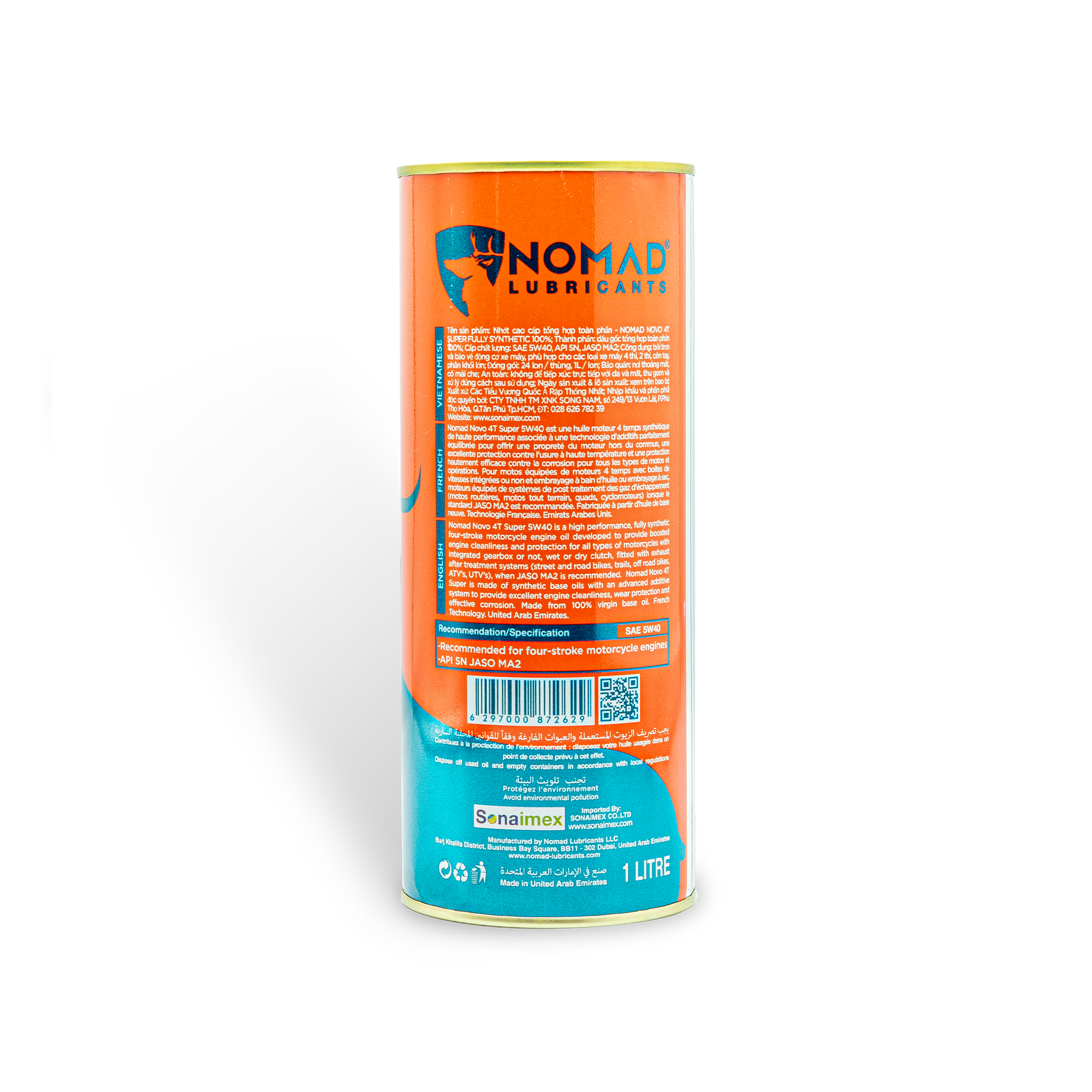 Nhớt tổng hợp toàn phần 100% NOMAD - SAE 5W40 - API SN - JASO MA2 – 1L Dầu nhớt xe máy nhập khẩu Dubai – Tổng hợp toàn phần 100% Chuyên dụng dành cho xe côn tay, xe phân khối lớn: Yamaha Exciter 135, Yamaha Exciter 150, Honda MSX125, Honda Monkey,…   GIỚI THIỆU SẢN PHẨM: Nomad Super 4T – 1L là dòng sản phẩm nhớt động cơ tổng hợp toàn phần 100% chuyên dụng dành cho xe côn tay. Sản phẩm được sản xuất từ dầu gốc nhóm IV và các loại phụ gia cao cấp giúp sản phẩm đạt chuẩn chất lượng cao nhất hiện nay. Đặc biệt, dòng nhớt có màu xanh dạ quang bắt mắt.   DUNG TÍCH ĐẶC BIỆT, THÊM SỰ LỰA CHỌN Với việc bổ sung thêm dòng Nomad Novo 4T Super 1L vào danh mục sản phẩm, giờ đây khách hàng là người tiêu dùng và các đại lý sẽ có thêm sự lựa chọn khi sử dụng xe máy có dung tích nhớt 1L Với thiết kế bao bì lon hiện đại và cứng cáp, Nomad Novo 4T Super 1L không những mang lại chất lượng sản phẩm cao cấp đồng thời còn mang đến sự bắt mắt và hiện đại khi được trưng bày trên kệ trong các cửa hàng. LỢI ÍCH SẢN PHẨM: