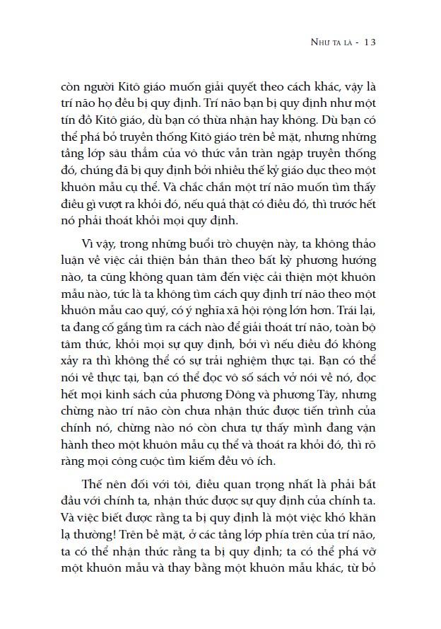 - Giải thoát tâm trí khỏi mọi sự quy định - Đã bao giờ bạn từng nghĩ, vì sao trên thế giới, có nơi chìm đắm trong nghèo khó nhưng cũng có nơi giàu có vô cùng? Vì sao những nỗ lực cải thiện bản thân, thôi thúc ta gặt hái thành công, lại đi kèm với những nỗi sợ hãi, thất bại và khổ đau? Theo triết gia Jiddu Krishnamurti, cấu trúc xã hội ngày nay được xây dựng dựa trên sự ganh tị, sự tích lũy, trong đó bao hàm sự tuân thủ, chấp nhận quyền lực, thỏa mãn tham vọng, mà về cốt lõi chính là cái “tôi”, cái bản ngã đang nỗ lực để trở thành điều gì đó. Xã hội được tạo nên từ chất liệu đó và nền văn hóa của nó – vui và khổ, đẹp và xấu, toàn bộ những nỗ lực của xã hội – quy định trí não con người. Vậy làm thế nào để tâm trí chúng ta thoát khỏi tất cả sự quy định này? Câu trả lời sẽ được tìm thấy trong quyển sách “Như ta là” (tựa gốc: “As One Is”) của Krishnamurti. Quyển sách tường thuật nội dung tám buổi nói chuyện có tính ngẫu hứng của Krishnamurti trước hàng trăm người, diễn ra dưới bóng râm của một rừng sồi nhỏ nơi thung lũng Ojai (California, Hoa Kỳ) vào mùa hè năm 1955. Tại đây, Krishnamurti đã dẫn dắt người nghe nhìn thẳng vào sự hỗn loạn, những thói quen và tư tưởng của một trí não bị ảnh hưởng bởi mọi sự quy định, đồng thời khám phá ra rằng đây là gốc rễ của mọi bạo lực cũng như khổ đau trên toàn thế giới. Xuyên suốt tác phẩm, Krishnamurti nhấn mạnh con đường duy nhất để khám phá ra sự thật cốt lõi của tất cả những điều trên, đi đến sự giải thoát, là tự biết mình; thấy chính ta như “ta là” trong thực tại, chứ không phải “ta phải là” hay “ta nên là”. Ông chỉ ra rằng bằng cách tự nhìn thấy trí não của mình đang bị chi phối ra sao bởi những uy quyền, khuôn khổ, phạm vi, truyền thống, quy định…, con người mới có thể thoát ra khỏi tất cả những điều đó. Một cách rốt ráo, Krishnamurti yêu cầu người nghe xem xét để nhận ra rằng tất cả mọi biểu hiện có vẻ tiến bộ của bản ngã không phải là sự tiến bộ dẫn đến tự do mà chỉ là guồng quay cũ của ảo tưởng; rằng sự hiểu biết trí não của chính mình, tự biết mình là con đường duy nhất dẫn đến tự do. Ông can đảm đối diện với những vấn đề thiết yếu của xã hội và dẫn dắt người nghe nhìn nhận chúng bằng minh triết để tự mình thấu hiểu, khám phá mọi sự thật bằng một tâm thức tự do hoàn toàn. Trong “Như ta là”, Krishnamurti đã lần lượt đề cập đến những vấn đề cốt lõi như: bản chất của bạo lực, vấn đề thay đổi, sự quy định của trí não, nền hòa bình thực sự, bản chất của sự sùng bái, sự tu tập tâm linh, và thế nào là thực sự lắng nghe… Ông cũng giúp cử tọa giải đáp một số thắc mắc “tại chỗ” như: dục vọng; tình trạng phạm tội ở tuổi thanh thiếu niên; bản chất của sự nhiễu loạn trong tâm trí; ý nghĩa, mục đích sống; việc nuôi dạy con cái; sự tái Với lối tiếp cận vấn đề một cách trực diện, Krishnamurti đã phơi bày tận căn nguyên gốc rễ của vấn đề, đồng thời hướng dẫn người nghe thấu hiểu cách chúng ăn sâu vào tiềm thức của chúng ta, ngăn trở ta tìm ra sự thật. Với ngôn từ giản dị, cách tiếp cận trực diện cùng những lập luận thuyết phục vốn có của Krishnamurti, “Như ta là” mang đến cho người đọc những kiến thức khai sáng đầy thông tuệ, những nhận thức mới mẻ về mặt tâm linh. Những điều suy nghiệm này tuy đã được nói ra từ hơn nửa thế kỷ trước nhưng vẫn chứa đựng những giá trị mới mẻ và thiết thực đối với thế giới cho đến ngày hôm nay. Khép lại cuốn sách, hy vọng mỗi người có thể tự tìm ra cho mình những sự thật bên trong bằng sự chú tâm trọn vẹn và quan sát chính mình từng phút giây. “Như ta là” chính là hành trang không thể thiếu cho tất cả những ai thực sự nghiêm túc trên con đường tìm kiếm hiểu biết tâm linh qua những lời dạy của Krishnamurti. Về tác giả: Jiddu Krishnamurti (1895 – 1986) là một triết gia, nhà diễn thuyết nổi tiếng về các vấn đề triết học và tinh thần, xoay quanh các chủ đề bao gồm: mục đích của thiền định, mối quan hệ giữa con người và phương cách để tạo nên sự thay đổi tích cực cho xã hội. Sinh ra trong một gia đình thuộc tầng lớp Brahmin tại Ấn Độ, nhưng Krishnamurti khẳng định rằng mình không thuộc bất cứ quốc tịch, tầng lớp, tôn giáo hay trường phái triết học nào. Ông dành suốt quãng đời còn lại của mình đi khắp thế giới như một nhà diễn thuyết độc lập. Krishnamurti không lệ thuộc vào bất kỳ tôn giáo, giáo phái, hay quốc gia nào. Ông cũng không tán thành bất kỳ trường phái tư tưởng thuộc học thuyết hay chính trị nào. Trái lại, ông quả quyết rằng những trường phái này chính là yếu tố phân chia con người với con người và tạo ra xung đột, cũng như chiến tranh. Lời dạy của ô