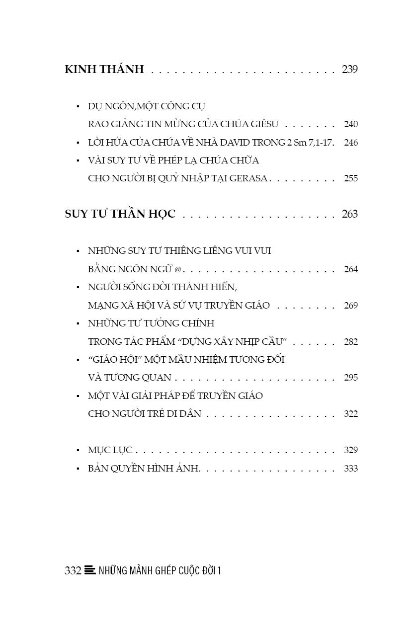Cuộc sống là một bức tranh tạo nên từ nhiều mảnh ghép. Có mảnh ghép tươi màu hân hoan, có mảnh ghép u sầu hoang mang. Có mảnh ghép nhẹ nhàng hồn nhiên, cũng có mảnh ghép chất nặng suy tư. Có những mảnh ghép đơn sắc nền nã nhu thuần, có những mảnh ghép đa sắc trộn pha từ những gam màu đa dạng trong đời. Có những mảnh ghép đan kết từ những giờ phút trào tuôn hứng khởi, cũng có những mảnh ghép chắt chiu từ những nỗi niềm miên man khát vọng. Bạn thân mến! Trên tay bạn là một bộ sưu tập những mảnh ghép của cuộc đời, lượm lặt từ trong những góc suy tư và những miền cảm xúc của một người trẻ luôn thao thức tìm ý nghĩa đời mình giữa cuộc nhân sinh vần xoay biến thiên theo năm tháng. Những mảnh ghép này là những suy tư được viết ra từ trong nhiều hoàn cảnh, thời gian và biến cố khác nhau. Chúng có thể là những tản văn, những câu truyện ngắn được ra đời khi chàng thanh niên thuở nào nhận ra rằng bản thân mình cũng có thể coi viết lách là một thú vui để tập có cái nhìn đa chiều hơn về nhiều khía cạnh trong cuộc sống. Chúng cũng có thể là những bài viết được ra đời nhân một biến cố nào đó trong đời sống đức tin hay đời sống thường ngày, khi chàng thanh niên thuở nào giờ đây đã khoác trên mình chiếc áo chùng thâm của đời chủng sinh và bắt đầu tập nhìn mọi thứ sâu xa hơn như một thao thức hiếu tri. Chúng cũng có thể là những suy tư mà thầy Đại Chủng Sinh ấy cảm nhận và góp nhặt trong quá trình sống tại Đại Chủng Viện, qua những môn học triết học và thần học được hấp thụ trong suốt quá trình đào tạo xuýt xoát một thập kỷ, hay trong hành trình mục vụ của mình với những kinh nghiệm được chín muồi theo năm tháng. Và nay khi là một Linh mục trẻ, người viết ấy muốn gửi “những mảnh ghép cuộc đời” đến bạn như một món quà nho nhỏ, đơn sơ và thân tình, dễ thương và chân thật. Không dám mong bộ sách “những mảnh ghép cuộc đời” này là một thứ hàn lâm tinh túy đến mức hoàn hảo có thể thỏa mãn nhu cầu của những đấng bậc học sâu hiểu rộng, chỉ mong được chia sẻ với những ai đồng cảm với một người trẻ thích cầm viết hí hoáy về nhiều khía cạnh trong cuộc sống. Mong rằng những tư tưởng trong “Những mảnh ghép cuộc đời” này có thể là chút gia vị nào đó cho cuộc sống muôn màu muôn vẻ thêm phần thú vị. Cách đặc biệt, xin cám ơn cha Khắc Đỗ, người anh em đồng môn nay cũng đã là Linh mục của Chúa, đã nhẫn nại nghiền ngẫm những suy tư đơn thành này và chia sẻ đôi lời tâm tình. Và hết sức trân trọng, con xin chân thành ghi ơn Đức cha Giuse Bùi Công Trác, cha Bề trên - Giám đốc Đại Chủng Viện Thánh Giuse Sài Gòn đã cho con những  dòng khích lệ rất quý giá. Con đưa bản thảo đầu tiên cho ngài lúc con là phó tế chuẩn bị chịu chức Linh mục và lúc ấy cha Bề trên Giuse chưa lãnh nhận chức thánh Giám mục, nhưng vì yêu thương con nên dù rất bận bịu với công việc chung, ngài vẫn dành thời giờ xem qua và khích lệ con trong công việc nhỏ bé này. Cách chung, xin cám ơn tất cả những ai đã đóng góp cách này cách khác để quyển sách này ra đời. Con Chiên Nhỏ