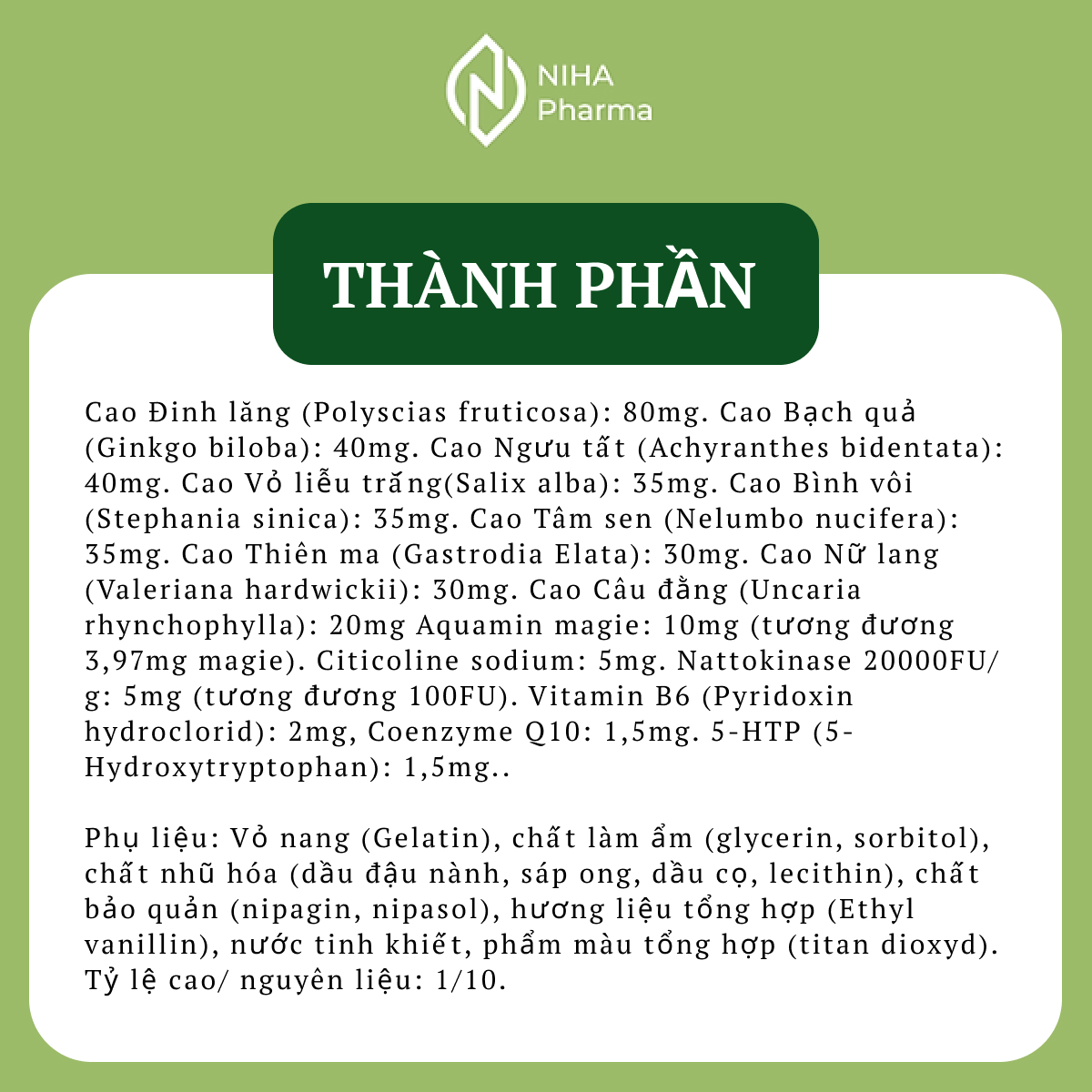 Cao Đinh lăng (Polyscias fruticosa): 80mg. Cao Bạch quả (Ginkgo biloba): 40mg. Cao Ngưu tất (Achyranthes bidentata): 40mg. Cao Vỏ liễu trắng(Salix alba): 35mg. Cao Bình vôi (Stephania sinica): 35mg. Cao Tâm sen (Nelumbo nucifera): 35mg. Cao Thiên ma (Gastrodia Elata): 30mg. Cao Nữ lang (Valeriana hardwickii): 30mg. Cao Câu đằng (Uncaria rhynchophylla): 20mg Aquamin magie: 10mg (tương đương 3,97mg magie). Citicoline sodium: 5mg. Nattokinase 20000FU/g: 5mg (tương đương 100FU). Vitamin B6 (Pyridoxin hydroclorid): 2mg, Coenzyme Q10: 1,5mg. 5-HTP (5-Hydroxytryptophan): 1,