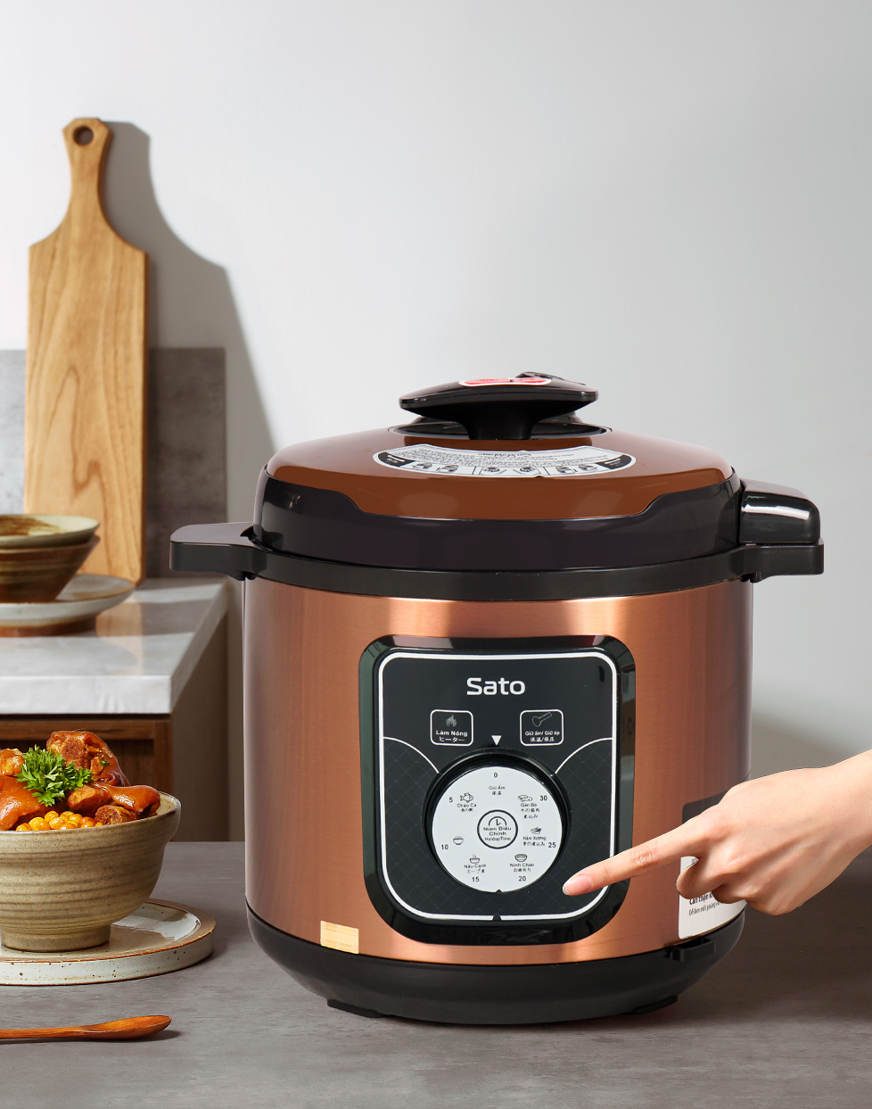 - Công nghệ Nhật Bản - Sản xuất tại Việt Nam! STT Thông Số Kỹ Thuật SatoAlpha 6AS039 1 Dung tích 6.0L 2 Chức năng Nấu cơm, nấu cháo, hầm gân, ninh, súp, hấp, giữ ấm 3 Màu sắc Vàng đồng 4 Loại nồi Nắp rời 5 Chất liệu vỏ nồi Nhựa cao cấp chịu nhiệt, thân nồi bằng tôn sơn tĩnh điện cao cấp. 6 Chất liệu lòng nồi Lòng nhôm phủ chống dính cao cấp 7 Công suất 1000 W 8 Điện áp 220 V/ 50 Hz 9 Màn hình Có 10 Hẹn giờ Có 11 Bảng điều khiển Núm vặn - cơ 12 Dây điện Dây rời 13 Phụ kiện Muỗng xới 14 Trọng lượng 4.3 Kg 15 Kích thước 330 x 330 x 420 (mm) 16 Bảo hành 12 Tháng 17 Thương hiệu SATO 18 Xuất xứ Việt Nam 19 Đặc điểm khác Công nghệ Nhật Bản - Sản xuất tại Việt Nam!