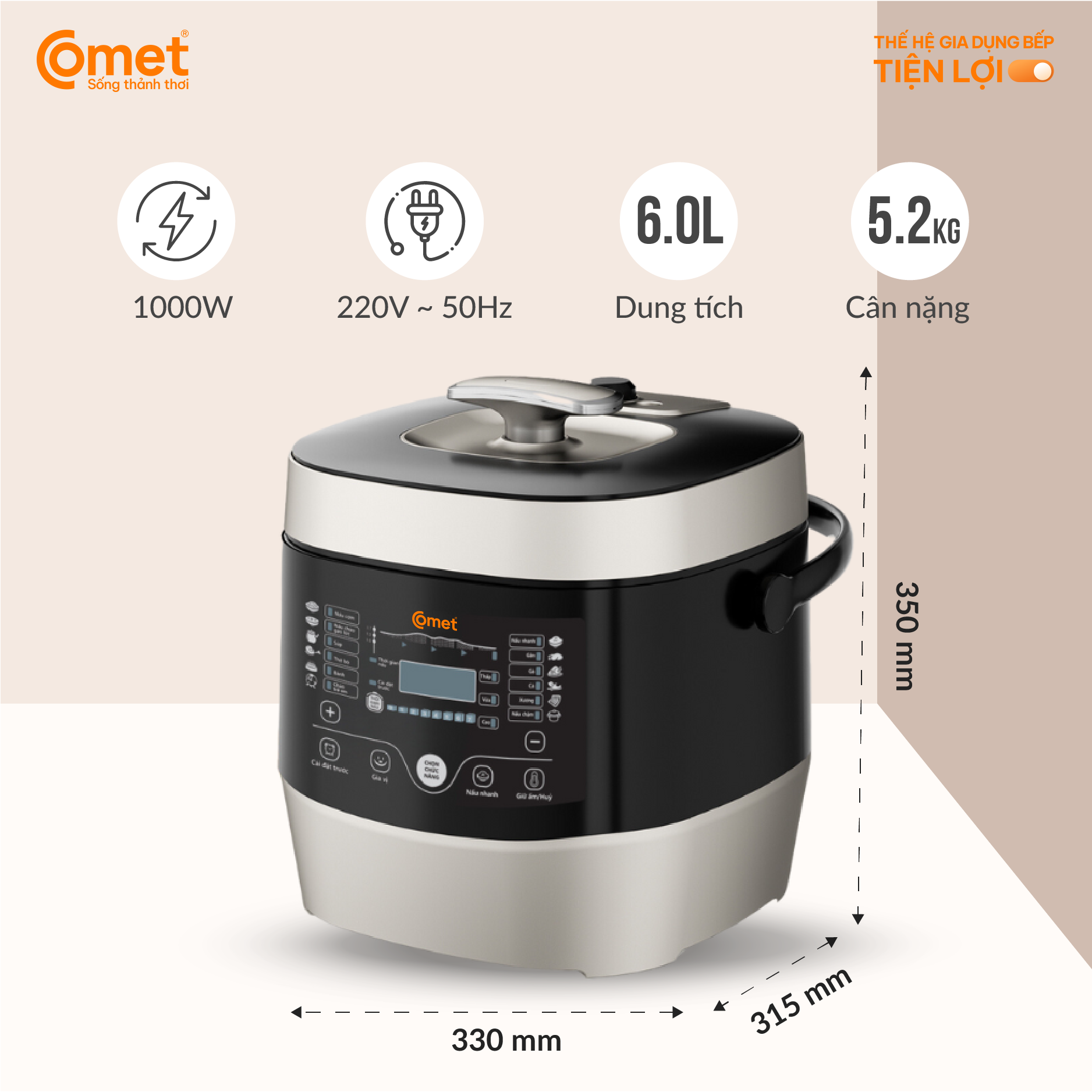 - Nồi áp suất điện tử Comet CM6168 là thiết bị nhà bếp hiện đại, đa chức năng, giúp công việc nấu ăn trở nên nhanh chóng, tiện lợi và tiết kiệm thời gian hơn cho người nội trợ. Với thiết kế sang trọng, nhỏ gọn, gam màu đen xám tinh tế cùng quai xách chắc chắn, sản phẩm phù hợp với nhiều không gian bếp hiện đại.