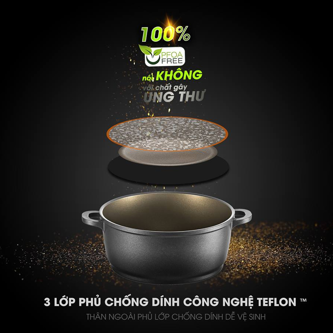 Lòng nồi được được phủ 3 lớp chống dính siêu bền, lớp chống dính 100 % không chứa hợp chất gây ung thư PTFE, PFOA an toàn tuyệt đối cho sức khỏe người tiêu dùng. Thân ngoài của nồi được phủ lớp chống dính khiến thức ăn khó bám dính giúp dễ vệ sinh sau khi sử dụng là được ưa dùng nhất