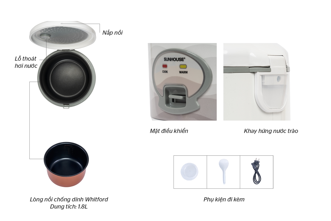 Cấu tạo 3 lớp siêu bền Nồi Cơm Điện Đa Năng Sunhouse SHD8602 (1.8L) là loại nồi cơm nắp liền thân của thương hiệu Sunhouse – xuất xứ từ Hàn Quốc. Sản phẩm có cấu
