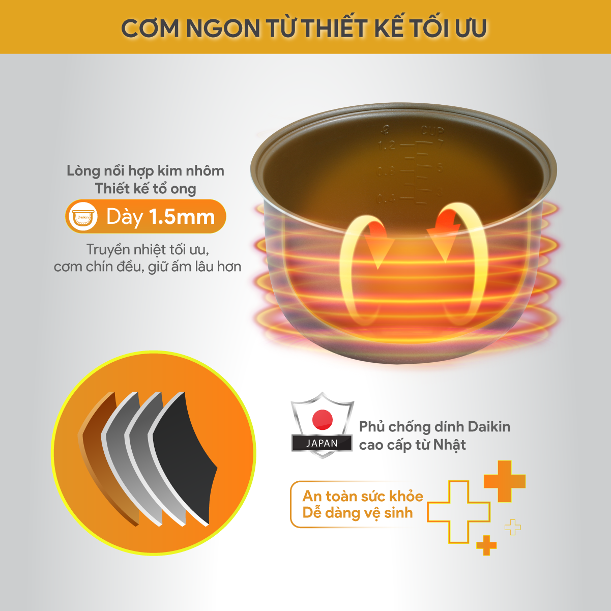 - Lòng nồi dày 1.5 mm cùng thiết kế tổ ong đặc biệt được phủ lớp chống dính Daikin cao cấp => Truyền nhiệt đều và tốt, an toàn cho sức khỏe, vệ sinh nồi dễ dàng, cơm không bám dính hay cháy khét, chín dẻo, ngon.