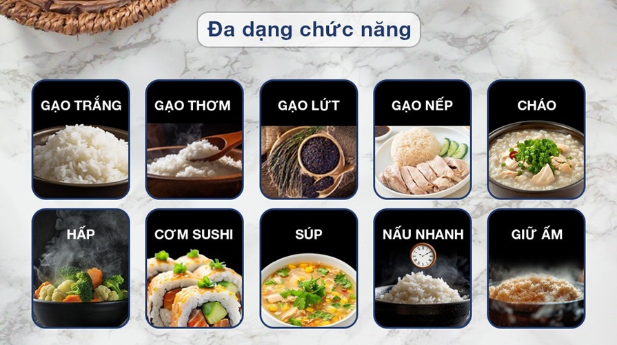 MENU ĐA NĂNG: • Chức năng nấu dinh dưỡng: Qunioa, Steel Cut Oatmeal, Brown, GABA Brown, Steam • Chức năng nấu cơm theo từng loại gạo: Long & Short Grain White, Premium, Congee(Thick & Thin),