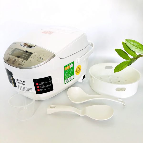 Nồi cơm điện tử kèm thêm xửng hấp để hỗ trợ những món hấp đơn giản như xôi, bánh bao, làm bánh,… và các dụng cụ khác như: dây nguồn 1.3m, cốc đong, muỗng cơm, muỗng canh