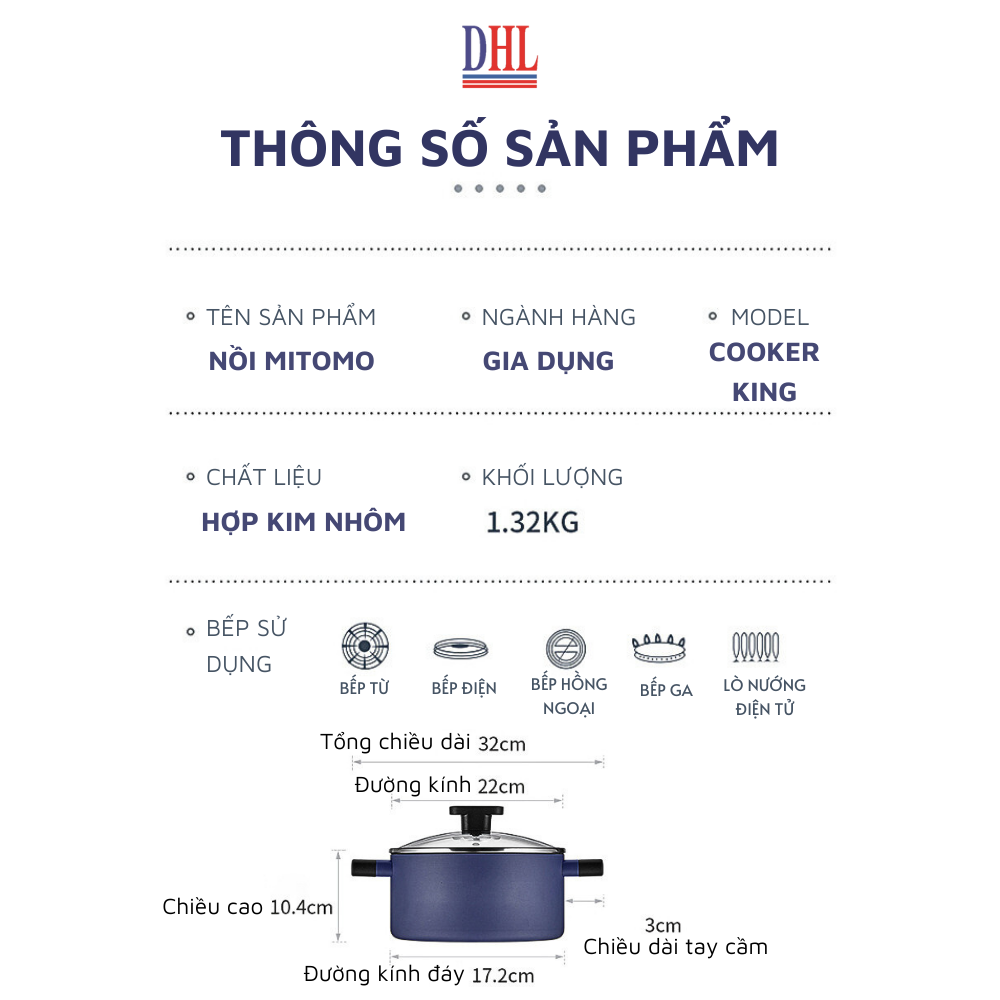 Nồi chống dính Mitomo Cooker King được làm từ thép hợp kim cao cấp, phủ lớp chống dính Dupont Teflon vân đá siêu bền và tuyệt đối an toàn cho sức khỏe, đáp ứng mọi nhu cầu chiên xào thay chảo rán thông thường.     Tinh tế tới từng chi tiết, tối ưu hóa công năng sử dụng Sắc xanh thời thượng, kiểu dáng trang nhã điểm tô cho căn bếp thêm ấn tượng, đồng thời cũng là món đồ trang trí cho bếp thêm đẹp sang. Thiết kế tối ưu phù hợp chế biến tất cả các loại món ăn đa dạng   Tương thích với mọi loại bếp Bộ nồi chảo chóng dính cao cấp Mitomo cookor King sử dụng được trên nhiều loại bếp khác nhau: bếp từ, bếp gas, bếp hồng ngoại, bếp điện,....   Lớp chống dính hoàn hảo Trang bị chống dính Dupont Teflon vân đá an toàn, siêu bền và có tính thẩm mỹ cao tựa như mang cả giải ngân hà lấp lánh vào trong căn bếp.   Lớp sơn phủ chống bám bẩn cao cấp Giúp dễ dàng vệ sinh và rửa sạch với nước, bảo vệ màu sơn một cách hiệu quả dù trải qua thời gian dài sử dụng.    Cấu tạo 6 lớp siêu bền, tuyệt đối an toàn cho sức khỏe