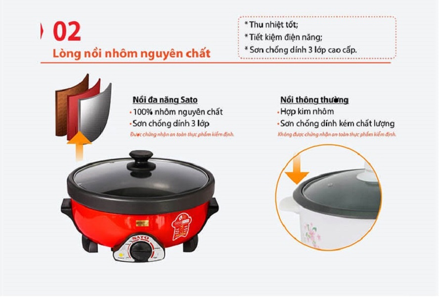 - Nồi Lẩu Điện SATO ST-351HP (3.5L) - Đỏ dùng để nấu lẩu, chiên, xào, rim và nấu canh, giúp bạn bổ sung nhiều món ngon vào thực đơn của gia đình. - Lòng nồi được làm từ nhôm