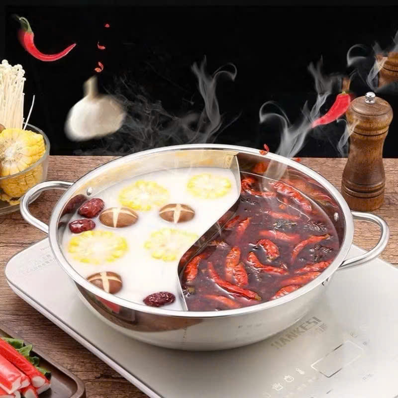 Mua tại TiktokNồi Lẩu Inox 2 Ngăn 30cm Nấu Được Bếp Từ và Bếp Gas, Có Nắp Kính Chất Lượng Cao