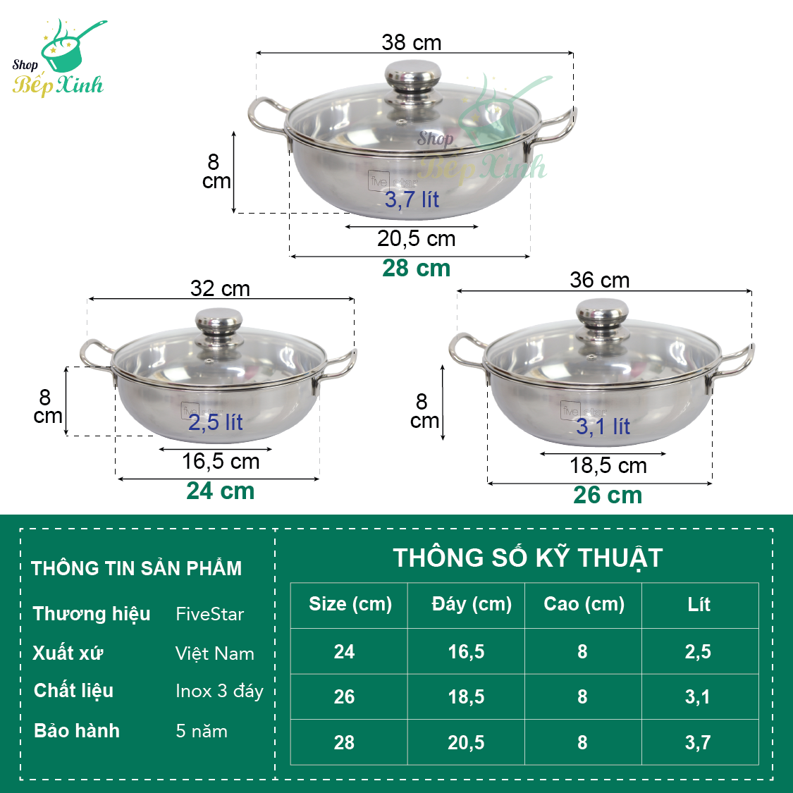 Nồi lẩu um xào inox 430 bếp từ 3 đáy Fivestar nắp kính ( 24cm / 26cm / 28cm ) NỒI LẨU INOX 32CM : – Thiết kế theo công nghệ hiện đại, kiểu dáng
