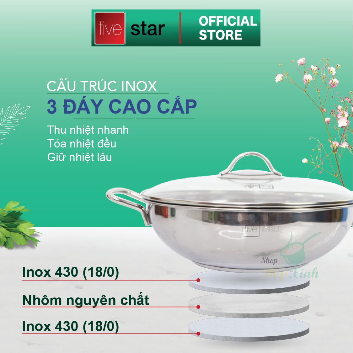 Chảo Inox 304 Fivestar size 32cm 3 đáy vung kính - Lẩu, xào, rán đủ kiểu - Bảo hành 5 năm 0986588655
