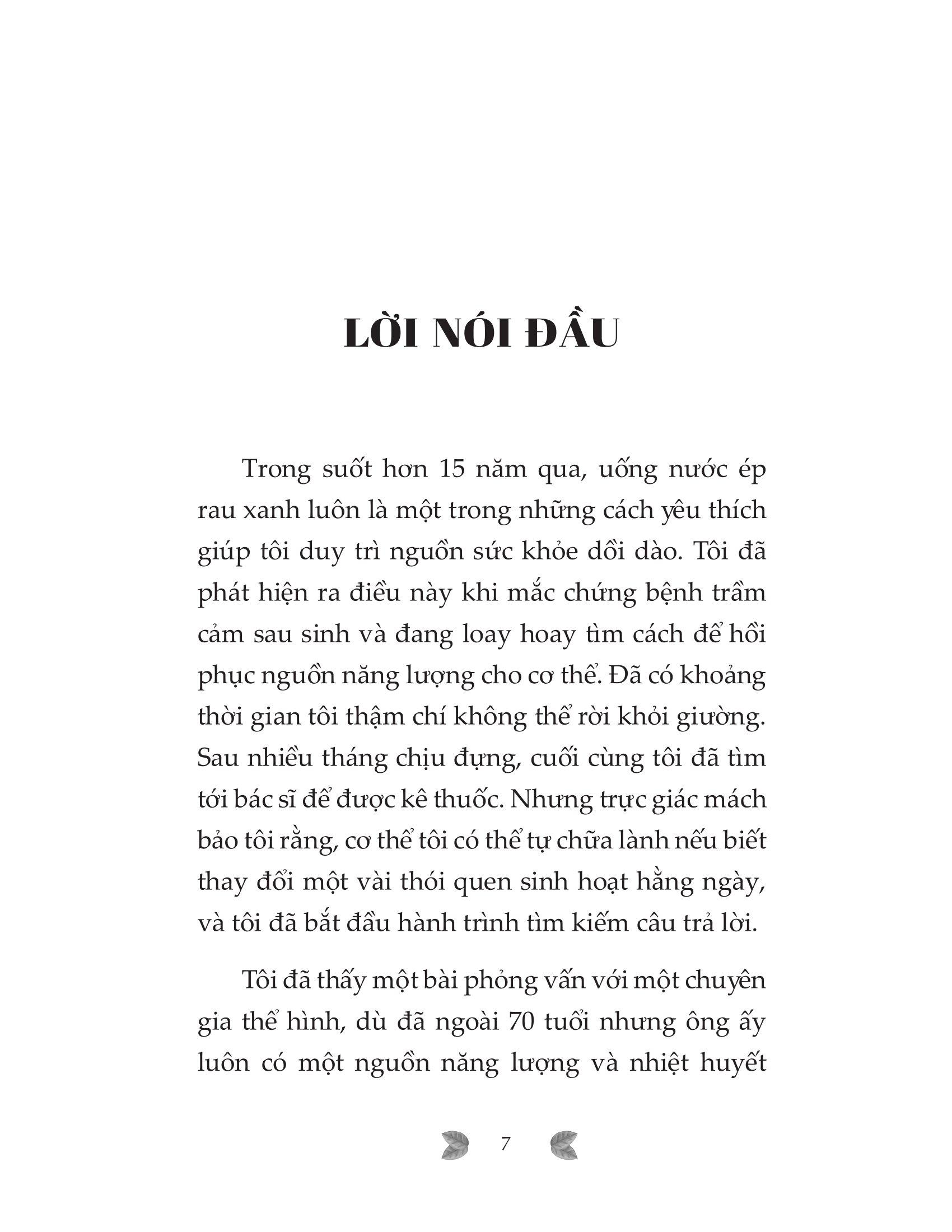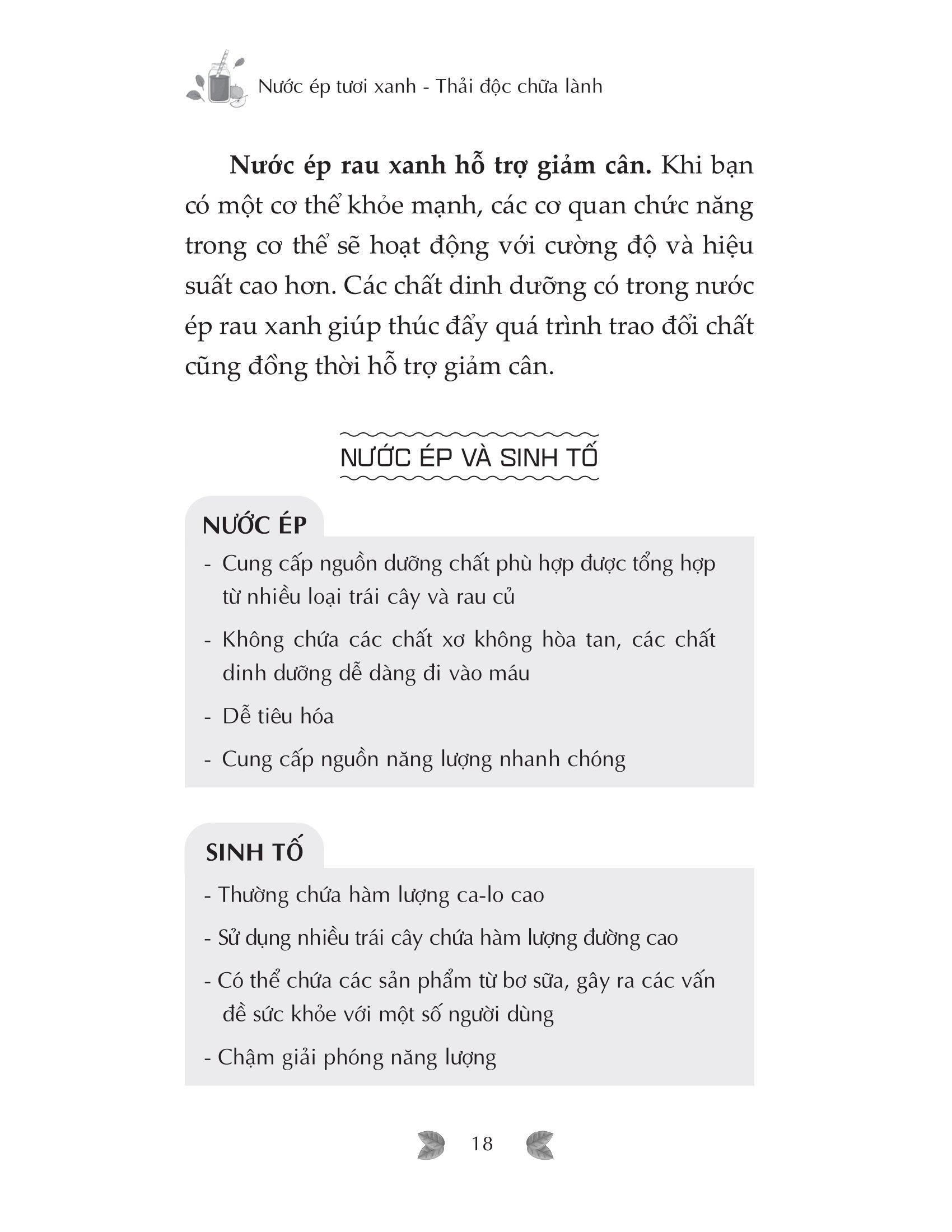 Tất cả các công thức nước ép rau xanh trong cuốn sách này đều bao gồm một số loại rau cùng với trái cây và các nguyên liệu dễ tìm. Mỗi công thức hiển thị một danh sách các thành phần, theo sau là hướng dẫn từng bước, các biến thể có thể có của công thức và tóm tắt nhanh các thông tin dinh dưỡng quan trọng như calo, carbs, hàm lượng chất xơ, Cuốn sách có tài liệu giáo dục ở phía trước, hướng dẫn chi tiết cho bạn về quy trình tạo ra một ly nước ép rau xanh ngon lành, cải thiện sức khỏe, cũng như một số bí quyết chọn máy ép tốt nhấ