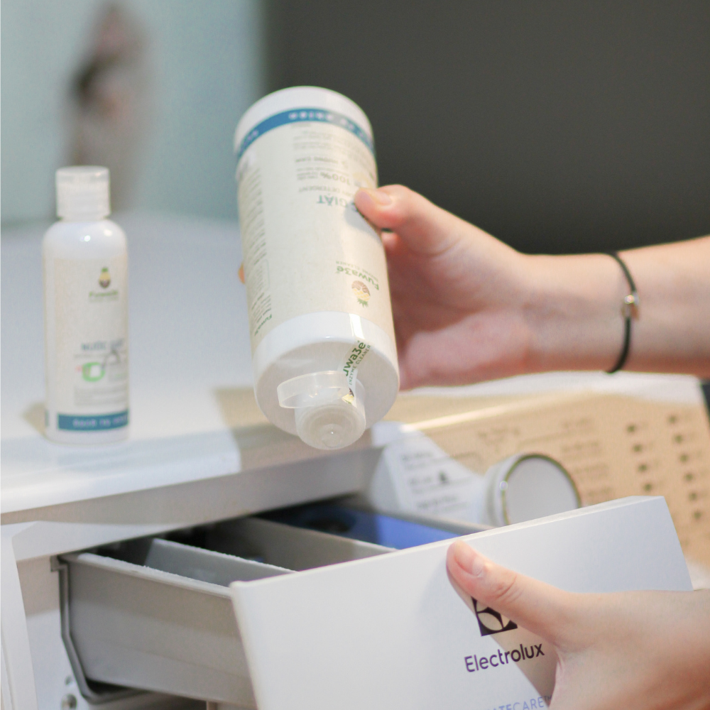 Đổ một lượng vừa đủ Nước Giặt An Toàn vào máy giặt hoặc trong thùng giặt.