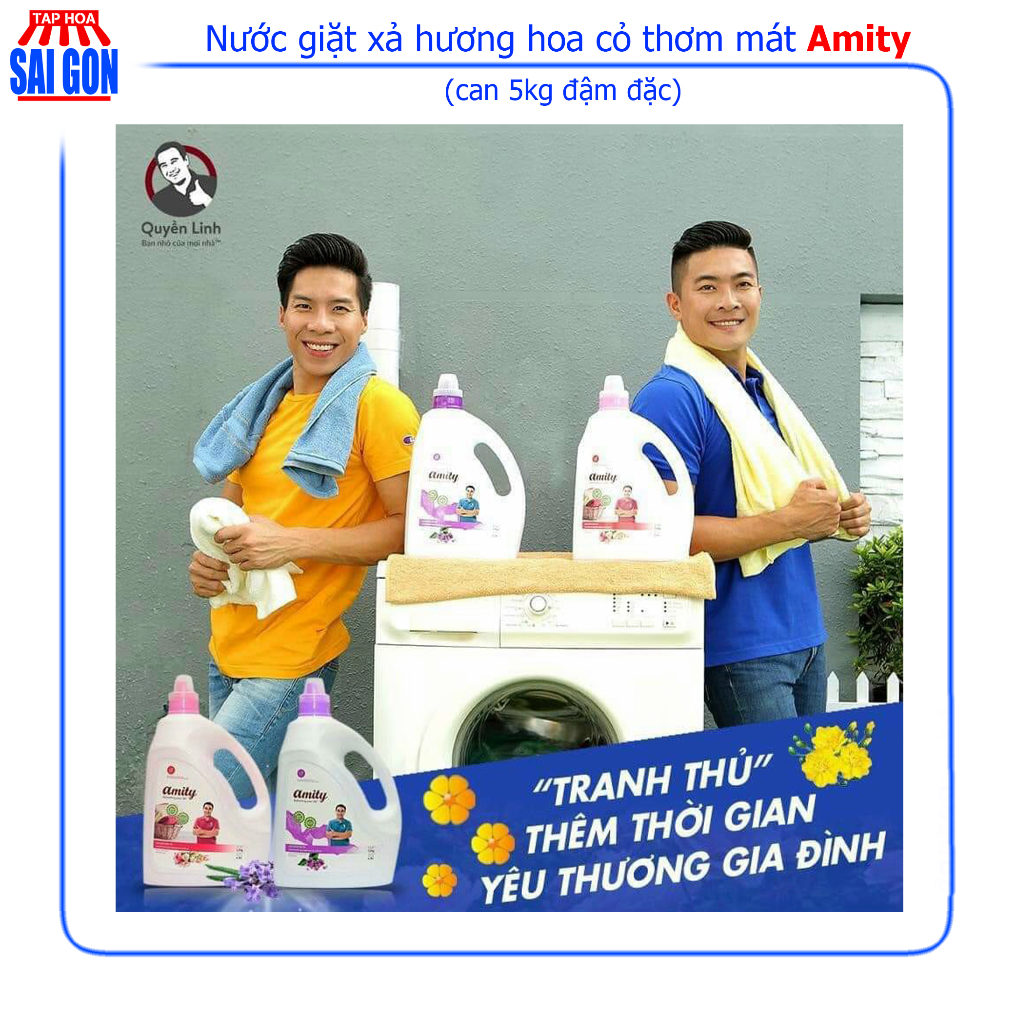 Nước Giặt Xả Amity hương hoa cỏ thơm mát can 5kg là một Thương hiệu của Cty Nghệ sĩ MC Quyền Linh Với công nghệ tích hợp 2 chức năng giặt và xả. Nước giặt xả Amity 2 trong 1 len lỏi, thấm sâu từng sợi vải giúp cho quần áo luôn sạch khuẩn, không bay màu thơm mát cả ngày Màu tím hương hoa cỏ thơm mát với công nghệ lưu hương nhẹ nhàng cho quần áo suốt cả ngày. Sản phẩm được sản xuất tại Việt Nam     Với công nghệ tích hợp 2 chức năng giặt và xả. Nước giặt xả Amity 2 trong 1 len lỏi, thấm sâu từng sợi vải giúp cho quần áo luôn sạch khuẩn, không để lại chất cặn trên quần áo giống như các loại bột giặt thông thường. Được áp dụng công nghệ cao với khả năng diệt khuẩn và lưu giữ hương thơm bền lâu ngay cả sau khi phơi. Sản phẩm đang được Tạp hóa Sài Gòn áp dụng giao hàng miễn phí toàn quốc