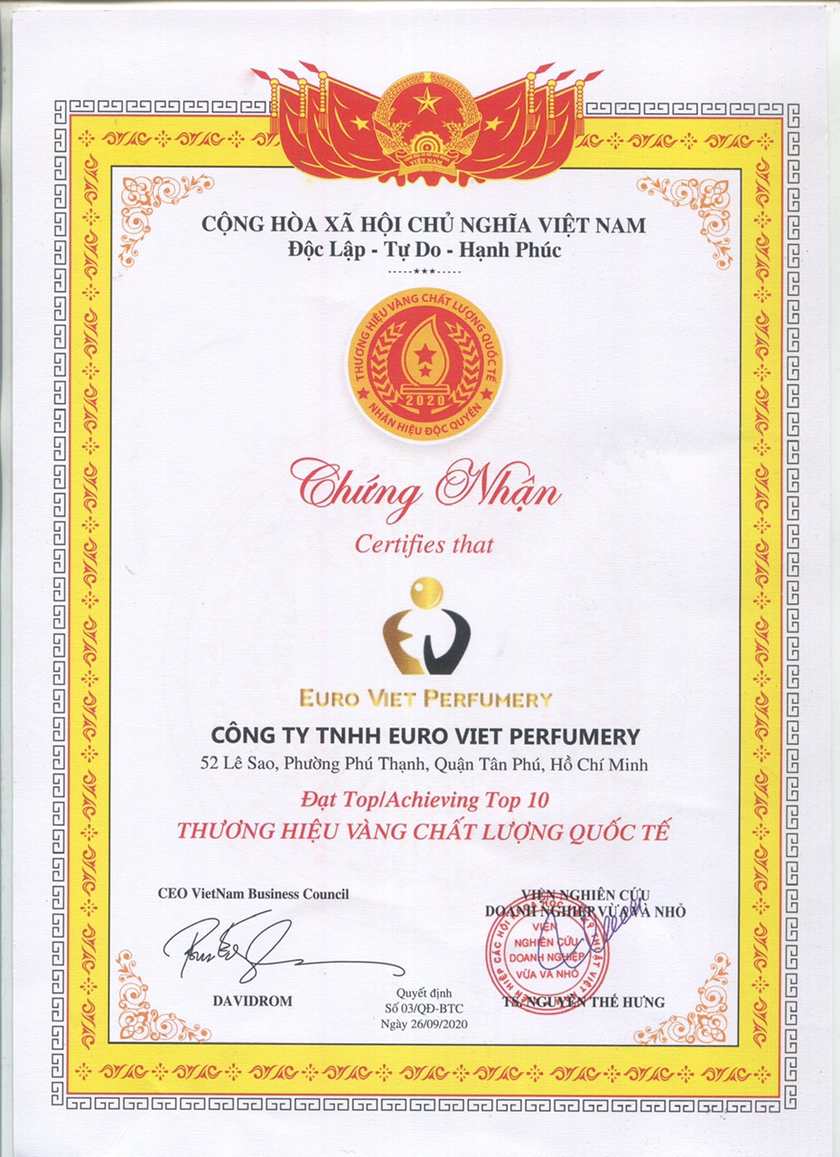 CAM KẾT HÀNG CHÍNH HÃNG 100% TỪ CÔNG TY SX-TM-XNK NƯỚC HOA EURO VIET CAM KẾT HÀNG CHÍNH HÃNG 100%!!! THÔNG TIN THƯƠNG HIỆU Thương hiệu: Euro Viet Perfumery Nơi sản xuất: Việt Nam Dung