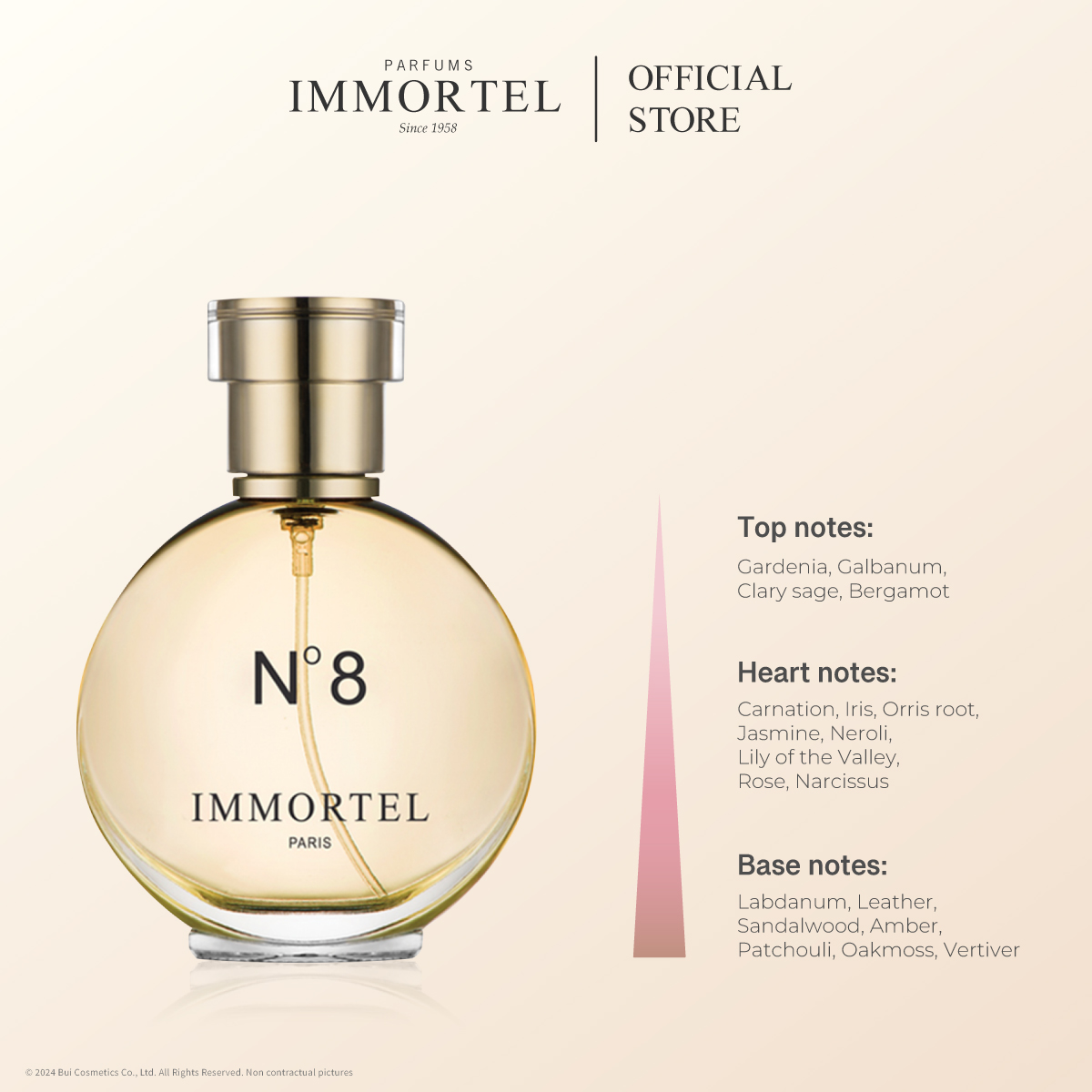 IMMORTEL PARIS ️ Nước hoa IMMORTEL được thành lập từ năm 1958 và là một trong những nhãn hiệu nước hoa nổi tiếng. Ngoài trụ sở chính ở Pháp, IMMORTEL đã có mặt tại Việt Nam và được phân phối độc quyền bởi Bui Cosmetics Co., Ltd. từ 2004 ️ Các sản phẩm nước hoa của IMMORTEL được chọn lọc kĩ lưỡng từ những dòng nước hoa chất lượng trong phòng thí nghiệm của IMMORTEL Paris và được nhập khẩu chính hãng từ Pháp, quê hương của nước hoa  Giới thiệu về Nước Hoa IMMORTEL PARIS N°8:   Vẻ đẹp gợi cảm và sang trọng: Hương thơm độc đáo, bí ẩn như một hợp âm cổ điển, được tạo thành từ gỗ sồi và hoắc hương, đan xen quấn quýt với tinh chất hoa hồng tháng 5, hoa cam và hoa nhài. Bạn đích thực là một người tao nhã và sang trọng khi lựa chọn N°8. Fragrance from France - Hương liệu nhập từ Pháp. Với mùi hương sang trọng, nồng nàn thích hợp cho những người phụ nữ muốn mình nổi bật ở những nơi cô ấy xuất hiện.  Nước hoa IMMORTEL N°8 là một bản giao hưởng với 3 tầng hương: - Hương đầu: Hoa dành dành, Nhựa cây, Cây xô thơm, Bergamot  - Hương giữa: Hoa cẩm chướng, Diên Vĩ, Củ Iris, Hoa nhài, Hoa cam đắng, Hoa thược dược, Hoa hồng, Hoa thủy tiên  - Hương cuối: Labdanum (nhựa hoa), Da thuộc, Gỗ đàn hương, Hổ phách, Hoắc hương, Rêu sồi, Cỏ hương bài  Hướng dẫn sử dụng: - Lắc đều, giữ chai cách cơ thể khoảng 15 - 20cm, xịt ở những vùng da tập trung nhiều mạch (cổ tay, sau gáy, ngực) - Không xịt trực tiếp lên quần áo, đồ trang sức - Bảo quản: nơi khô ráo, thoáng mát, tránh ánh nắng trực tiếp và nhiệt độ cao   CAM KẾT: + Sản phẩm do IMMORTEL phân phối là hàng chính hãng 100% + Sản phẩm được sản xuất và đóng gói một cách kỹ lưỡng. Chất lượng đồng đều cho tất cả dung tích + IMMORTEL hoạt động với tiêu chí đặt lợi ích của khách hàng lên hàng đầu, nghiêm túc, trung thực, tận tâm + Hoạt động đa nền tảng, đồng bộ hóa thương hiệu để khách hàng có thể tìm kiếm và liên lạc một cách tiện lợi nhất