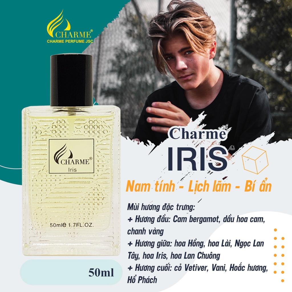 - Phong cách: Nam tính, lịch lãm, bí ẩn Charme Iris mang hương gỗ nồng thơm. Vừa nồng nàn, vừa hứng khởi, vừa tươi mới. Hương vị cam Bergamot và bưởi xuất hiện đầu tiên và dẫn lối, sau đó từ từ hòa quyện cùng bạc hà thơm mát, sảng khoái. Khi lớp hương phai dần, thì sự ấm áp, nồng nhiệt, gợi cảm lại được bùng cháy lên với hạt bạch đậu khấu, gừng, song song đó, mùi hồ tiêu, cỏ hương bài, hoa nhài giúp cho mùi hương trở nên cân bằng hơn khi sử dụng. Cảm nhận kỹ hơn sẽ thấy thoang thoảng hương hoa cỏ tươi mát, dịu dàng, thơm ngát của Floral - đặc trưng mùi hương từ các loại lá, hương cỏ, có mùi của hoa của thiên nhiên, lãng mạn. Làm tăng cường sinh lực và tạo cảm giác nhẹ nhàng, thanh thản khi đến với Nước Hoa Nam Charme Iris. Hương đậu khấu nghiền nát trộn với hồ tiêu hồng thoang thoảng trên bề mặt nước gừng. Khi lớp hương đầu phai dần, nước hoa sẽ càng thêm cuốn hút hơn với mùi hương gợi cảm, ấm áp của hạt đấu khấu và gừng. Hồ tiêu quyện với hương thơm nhẹ nhàng của cỏ hương bài và hương hoa càng làm mùi hương trở nên ấm áp, dễ chịu. Mùi hương chuẩn như Bleu Chanel nổi tiếng trên thế giới.