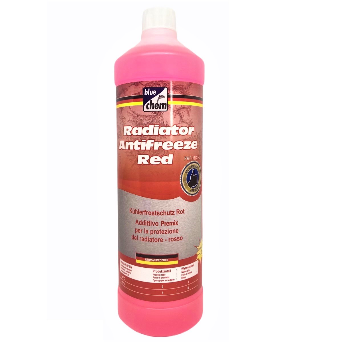 bluechem Radiator Antifreeze Red là một chất cô đặc dựa trên hợp chất Mono-Ethylene Glycol (1.2-ethanediole), chất bảo vệ bộ tản nhiệt và chất trao đổi nhiệt để vận hành cả, mùa hè và mùa