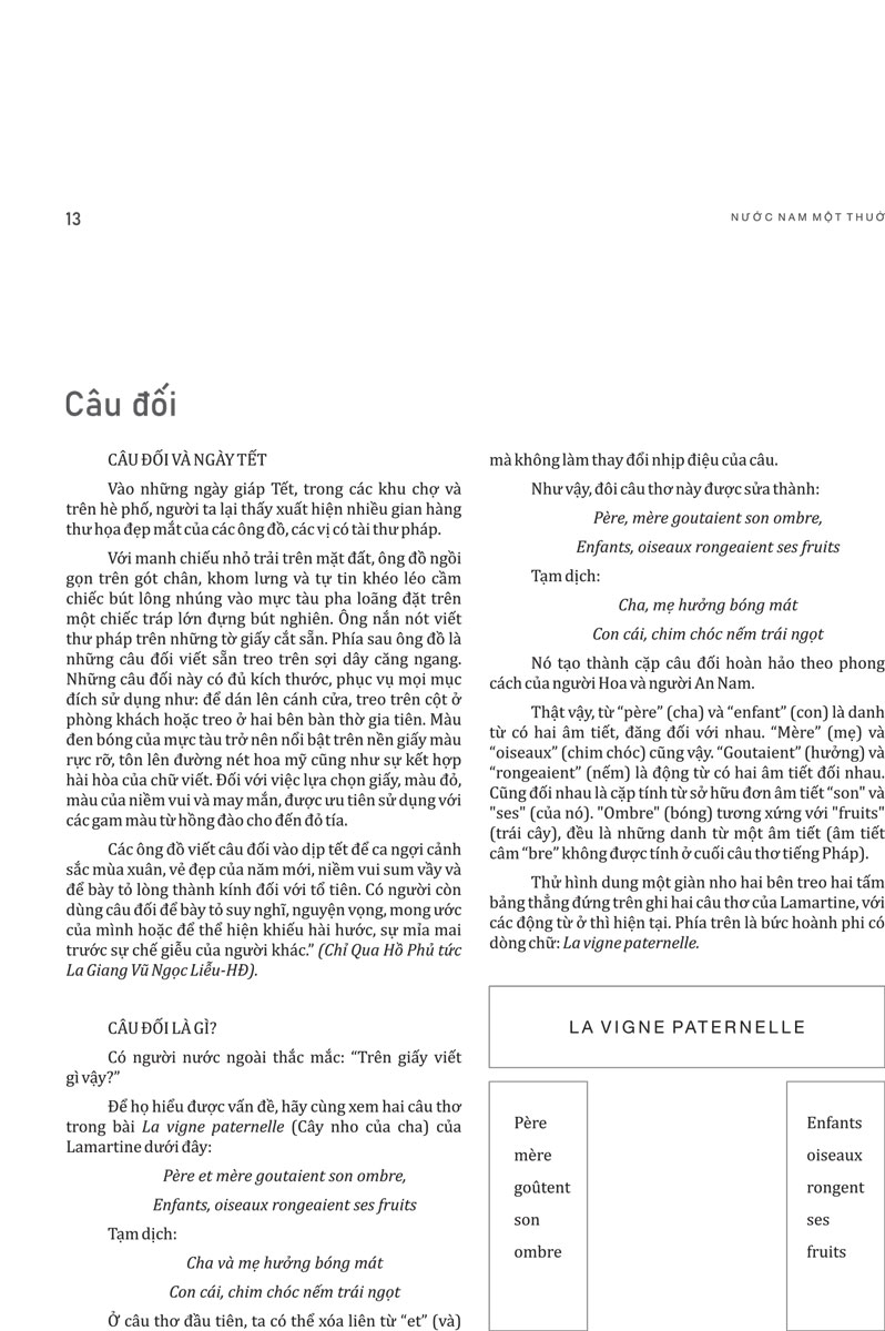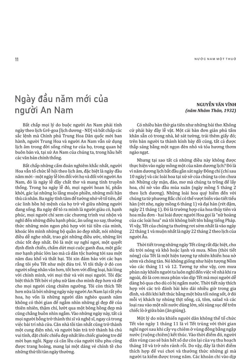 Mua tại TiktokNước Nam Một Thuở (Bìa Cứng) “Một trong những cuốn sách truyền tải trọn vẹn nhất giá trị lịch sử – văn hóa đặc trưng của đất Việt, người Việt.” “Có một thực tế đang diễn ra trong đời sống văn hóa đọc, trong xu thế nhận thức về quá khứ là xuất hiện trào lưu khơi dòng và chuyển ngữ khối tài liệu tiếng Pháp “thời thuộc địa” và xuất bản cho độc giả Việt.” – Sử gia Dương Trung Quốc Nước Nam một thuở là cuốn sách tập hợp 38 công trình nghiên cứu, bài viết tiêu biểu bằng tiếng Pháp và 60 tranh ảnh phong phú về đất nước, con người An Nam đăng trên các Tạp chí Đông Dương, Tạp chí Viễn Á, Tuần san Đông Dương, Tập san Dân Việt Nam xuất bản từ năm 1894-1948, do Trung tâm Lưu trữ quốc gia I tuyển dịch sang tiếng Việt. Ấn phẩm chủ yếu khai thác các bài tiểu luận có chất lượng ẩn trong các hồ sơ lưu trữ, trong đó có các ấn phẩm định kỳ phát hành từ năm 1948 trở về trước… Tác giả của những công trình này là các học giả, nhà khoa học, quan chức người Pháp và người Việt như: Louis Bezacier, Gustave Dumoutier, Pierre Pasquier, Cerutti, Henry Bontoux, Paul Boudet, G. Tucat, Ngô Quý Sơn, Nguyễn Văn Vĩnh, Nguyễn Xuân Chữ… Họ đã nghiên cứu kỹ lưỡng về nhiều lĩnh vực của đời sống: văn hóa, giáo dục, du lịch, quân sự, y tế, ngành nghề truyền thống… Các bài viết được lựa chọn và sắp xếp, hệ thống hóa theo chủ đề và trình tự thời gian. Mỗi bài viết đều có hình ảnh minh họa, ghi rõ tác giả, ký hiệu tra tìm, niên đại. Đối với những bài viết không có hình ảnh, Ban Biên soạn đã sưu tầm, bổ sung hình ảnh đồng thời ghi rõ nguồn dẫn để cuốn sách thêm phần sinh động. Đối với tên phố và đường ở Hà Nội và Sài Gòn, chúng tôi giữ nguyên tên gốc tiếng Pháp và bổ sung tên gọi tương đương hiện nay. Trong quá trình thực hiện, nhóm biên dịch đã gặp không ít khó khăn. Một số bài dịch từ chữ Hán, chữ Nôm, vốn có nhiều khái niệm trừu tượng, khó hiểu cũng như không có câu, từ tương đương trong tiếng Pháp; tác giả đồng thời là người dịch Hán-Nôm chỉ chuyển ý tóm lược, chẳng hạn như bài “Thi Hương” hay bài “Câu đối”. Thêm vào đó, một số địa danh hay tên người bị tác giả người Pháp viết sai, hoặc không dấu (tiếng Việt) gây nhiều khó khăn cho người dịch. Vẫn trong một số bài dịch từ chữ Hán, chữ Nôm, có nhiều sử tích và sự kiện lịch sử quá xa thời đại chúng ta hiện nay. Chẳng hạn, các sự kiện lịch sử, chiến tranh giữa các triều đại của Trung Hoa thể hiện trong các đề thi và bài làm của thí sinh “thi Hương” mà tác giả người Pháp đồng thời là người dịch không chú thích rõ ràng khiến người dịch từ tiếng Pháp sang tiếng Việt (qua hai lần chuyển ngữ) rất khó để xác minh đúng hay sai sự kiện. Trong tất cả các trường hợp trên đây, người dịch cũng như người hiệu đính, biên tập đã phân tích từng trường hợp trong bài viết để chấp thuận các giải pháp chuyển ngữ (có thể): chuyển ý, chuyển câu hoặc dịch từng từ sao cho sát ý, người đọc có thể chấp nhận được và dễ hiểu. Nước Nam một thuở thuộc Tủ sách Lịch sử-Văn hóa, nằm trong dự án hợp tác giữa Omega Plus và Trung tâm Lưu trữ Quốc gia 1.