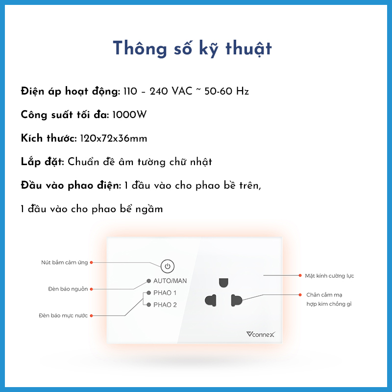 ✨Ổ cắm chống giật cho phao điện, bồn, bể ngầm Vconnex. Nút bấm cảm ứng bật tắt an toàn.