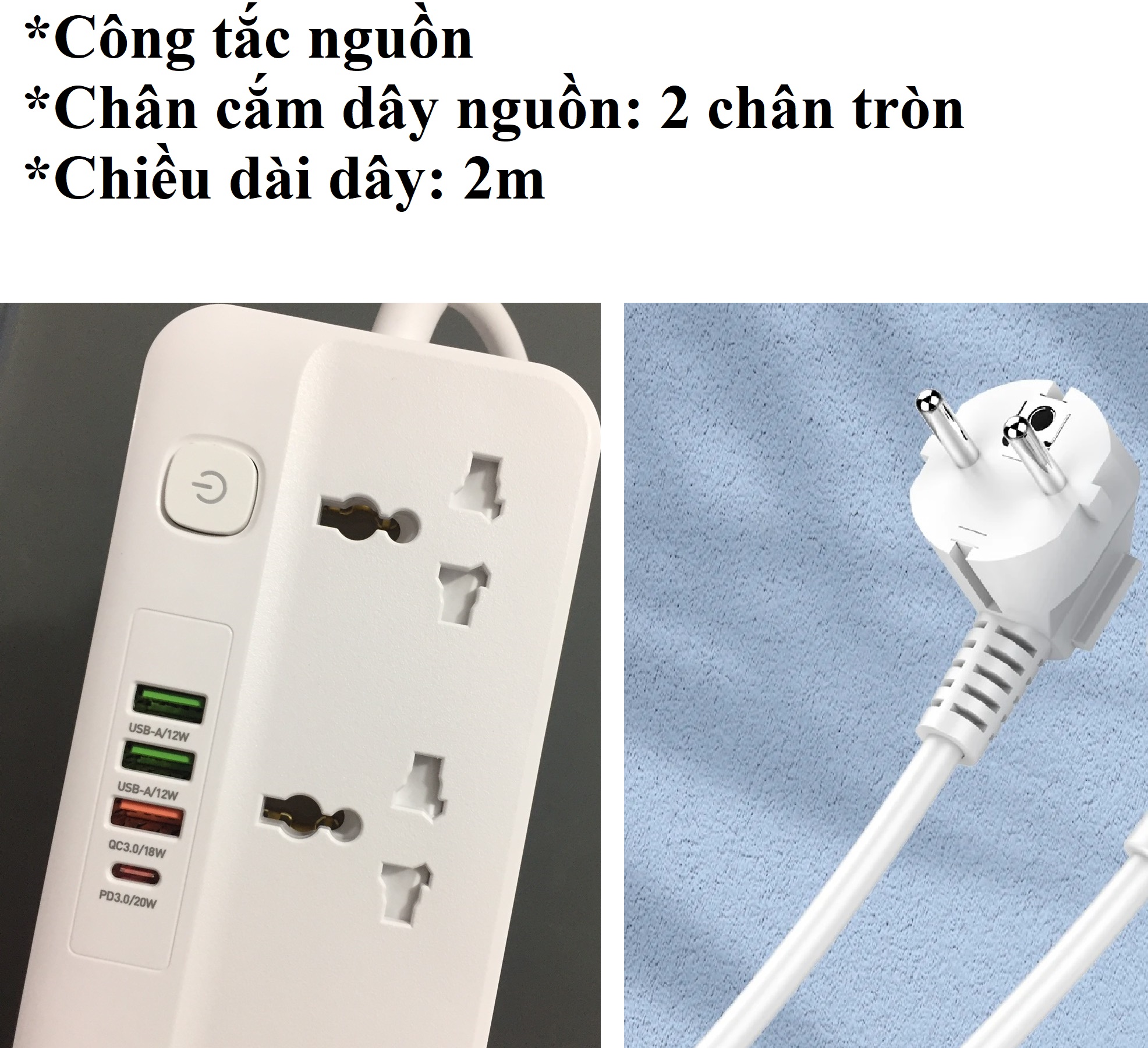 Ổ cắm đa năng cách điện bền đẹp. Chịu nhiệt, chống cháy: 750ºC Chống sét ( có dây tiếp đất) Chiều dài dây điện: 3 mét * CHI TIẾT SẢN PHẨM Chân tiếp xúc với
