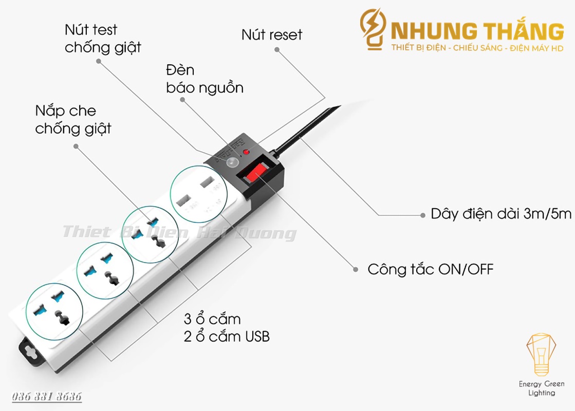 Ổ cắm 3 ổ đa năng + 2 ổ cắm USB cách điện bền đẹp - Chịu nhiệt, chống cháy: 750 độ C - Chiều dài dây điện: 1.8 mét - Chân tiếp xúc với