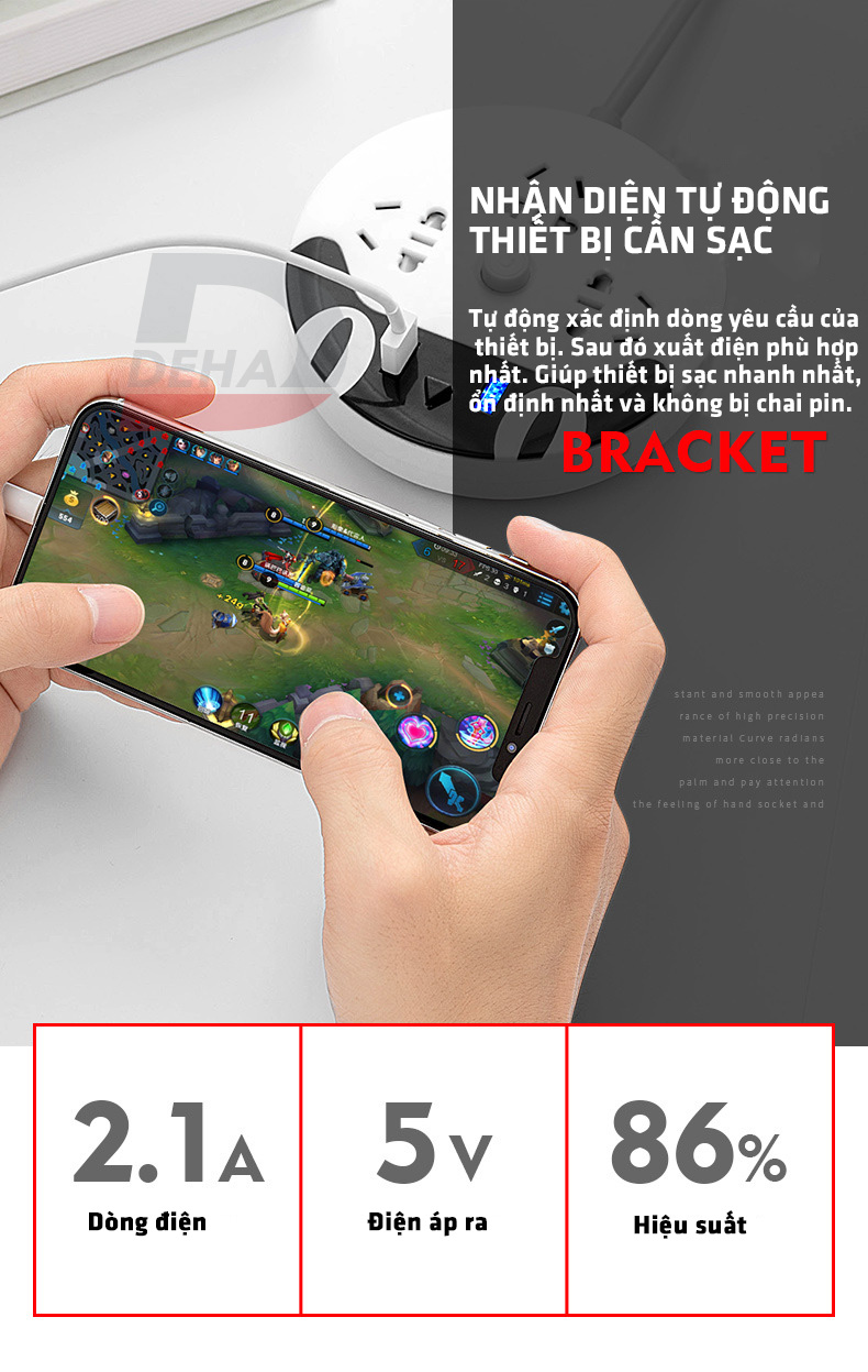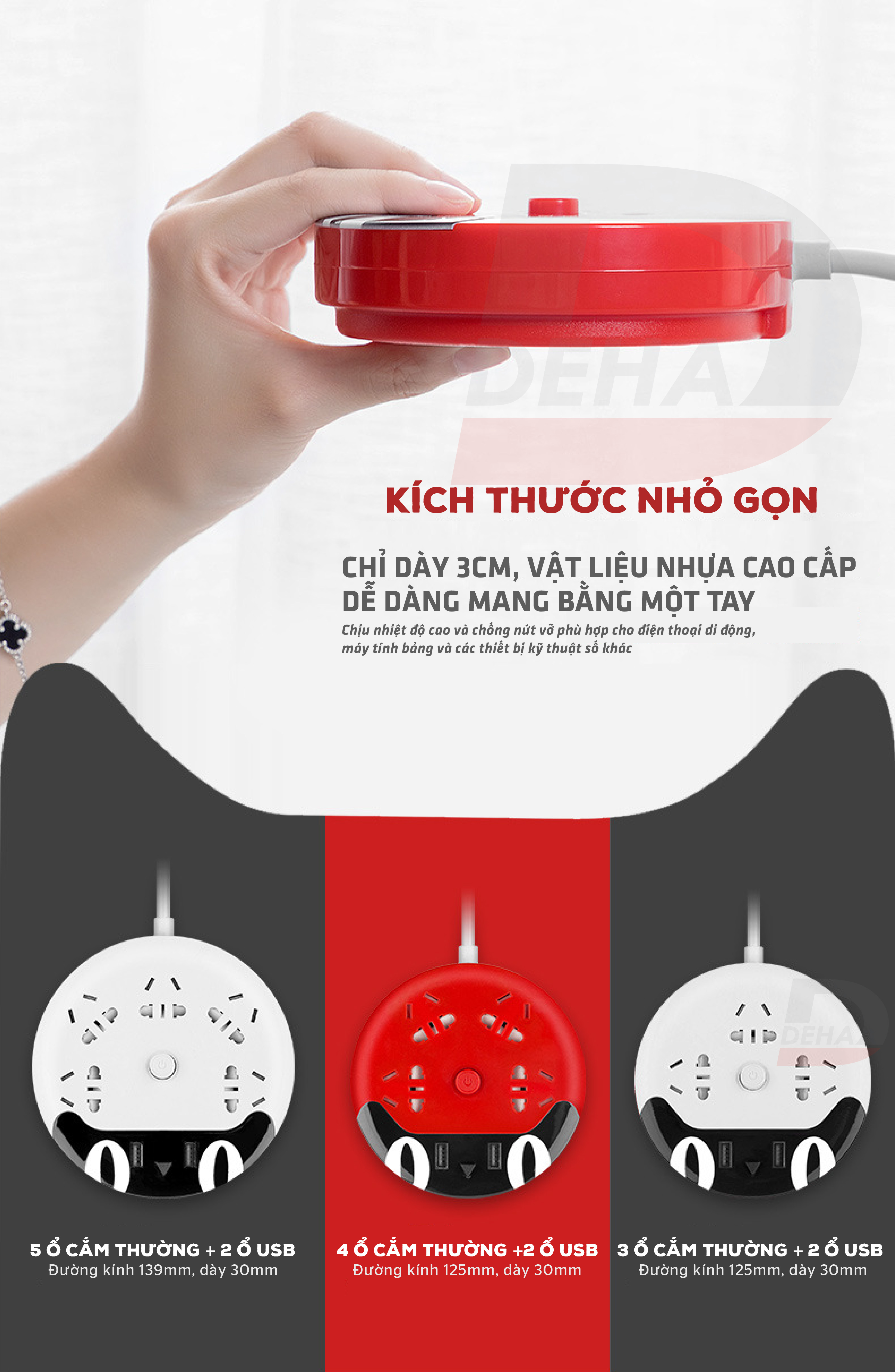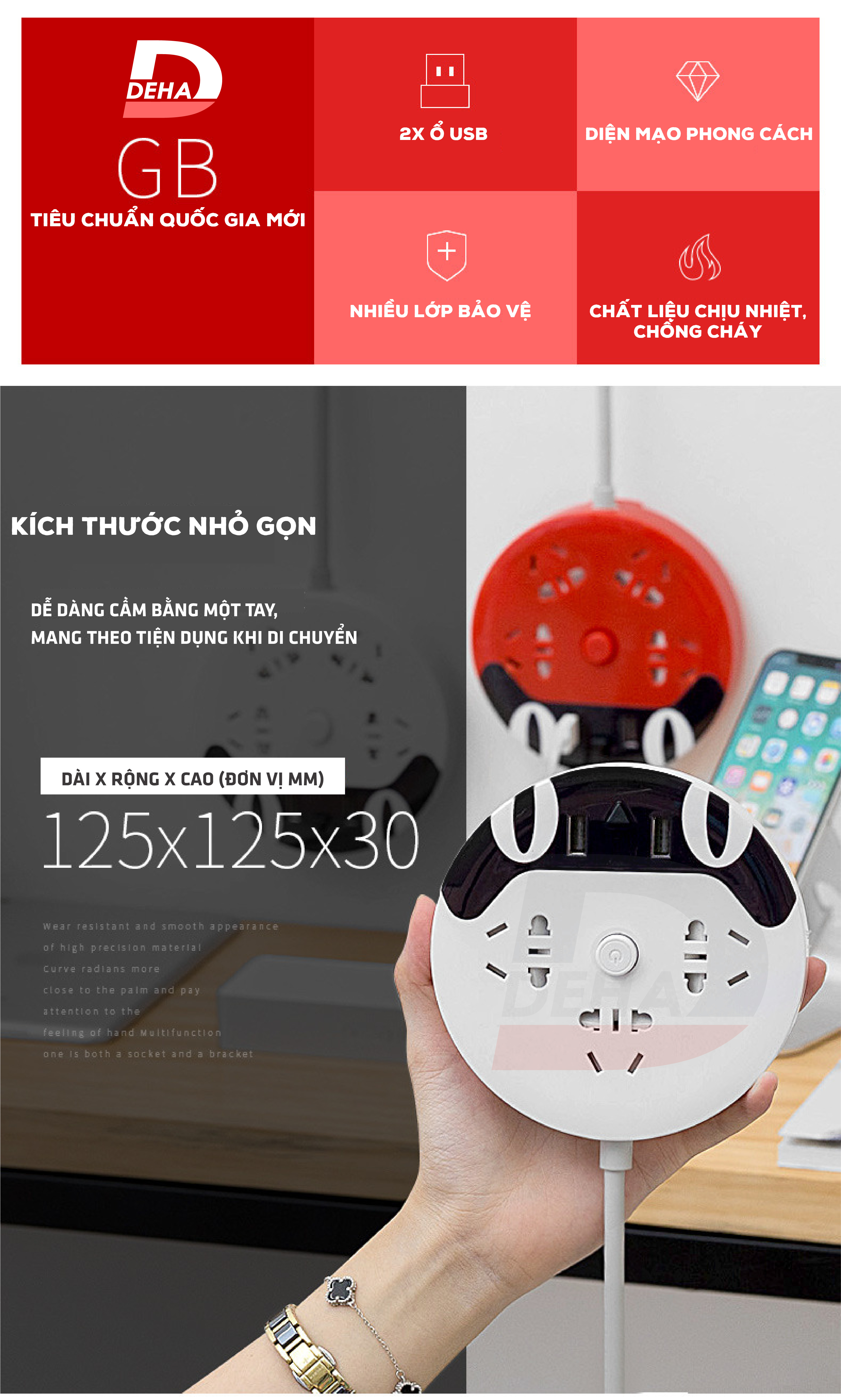 Ổ cắm 3 ổ đa năng + 2 ổ cắm USB cách điện bền đẹp - Chịu nhiệt, chống cháy: 750 độ C - Chiều dài dây điện: 1.8 mét - Chân tiếp xúc với