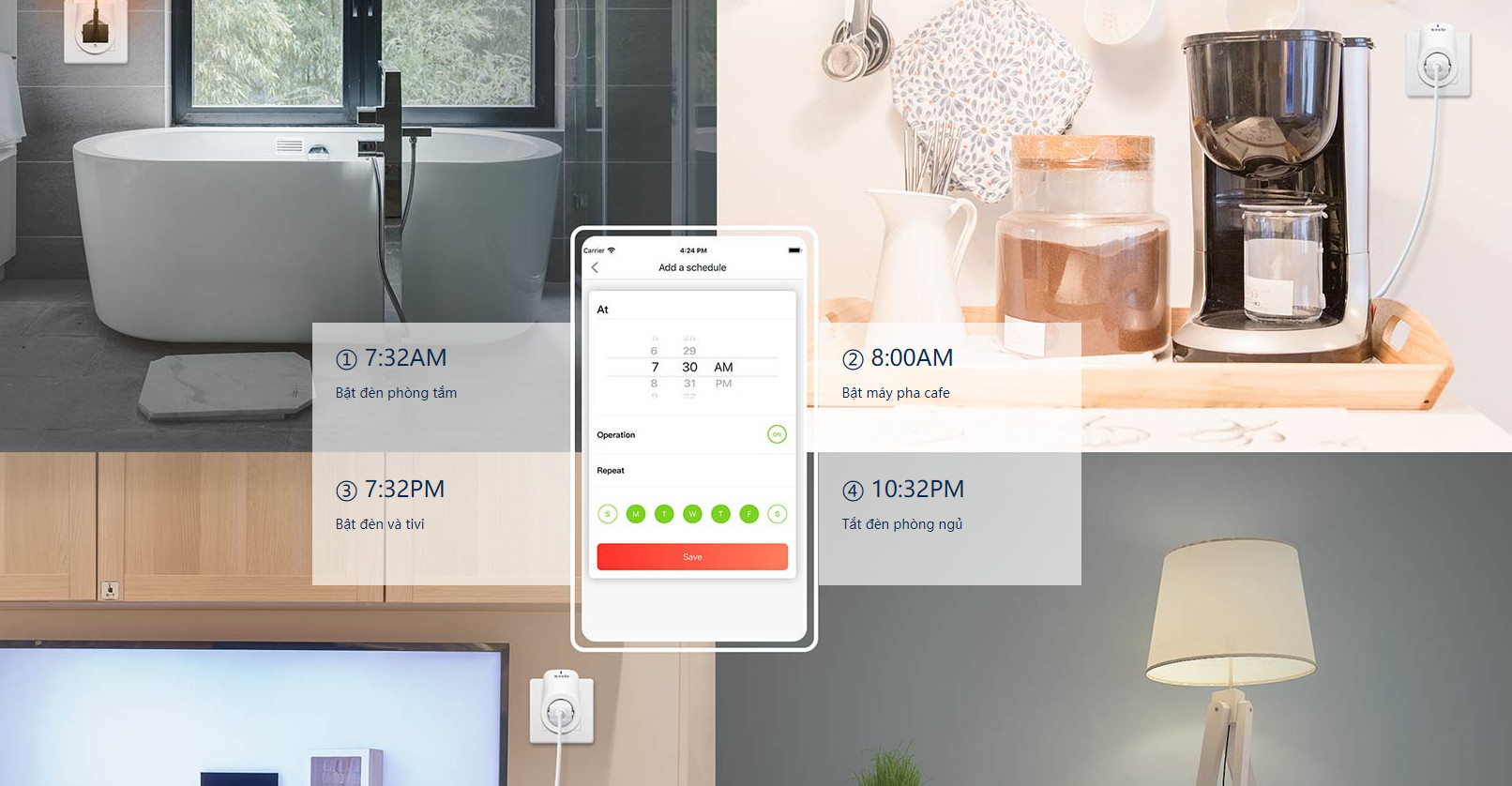 Mở rèm vào lúc 8h sáng và đóng rèm lúc 8h tối Mở rèm khi bạn trở về nhà Khi trời tối thì rèm tự động đóng lại và bật đèn lên cùng lúc THÔNG