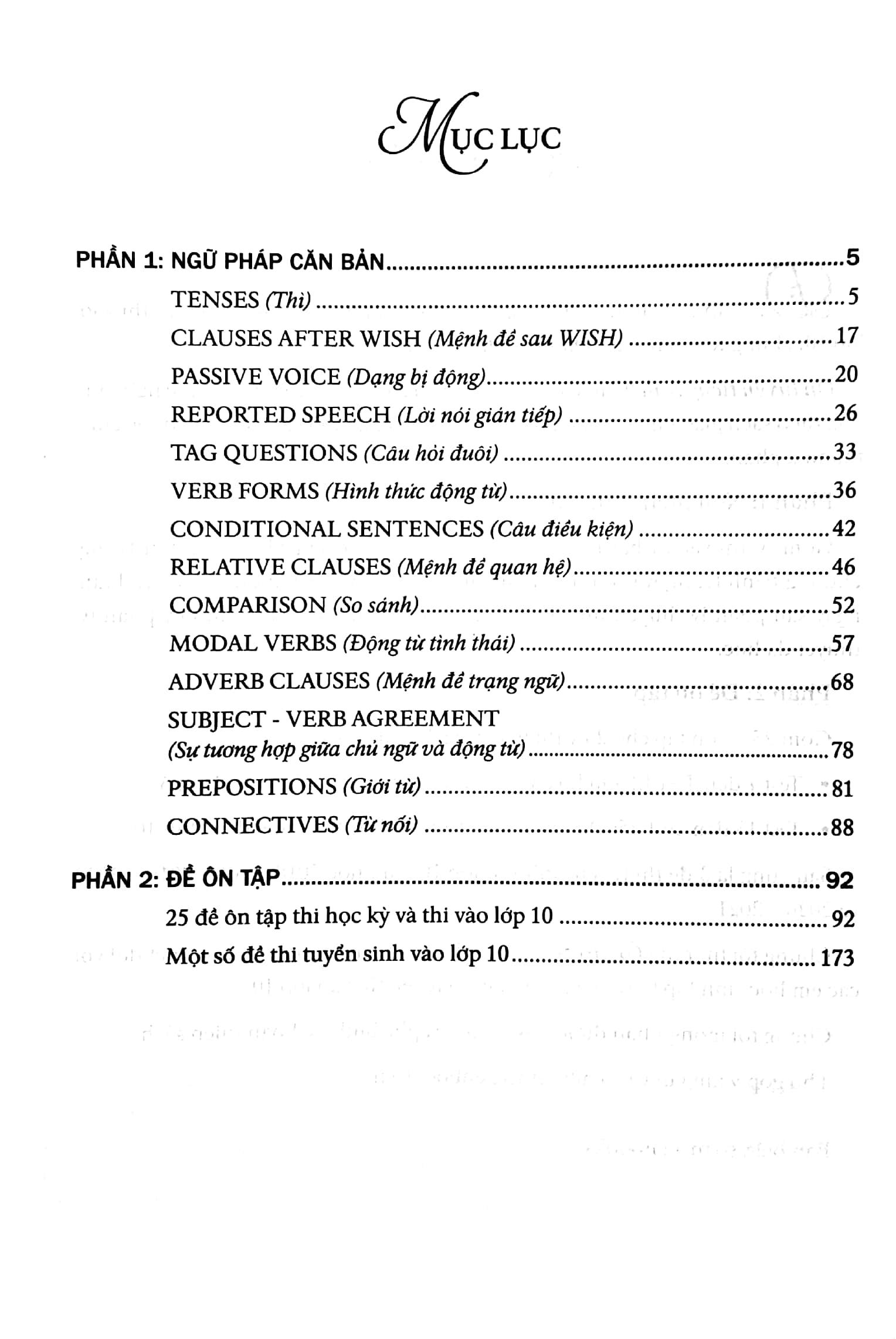 Gồm lý thuyết và bài tập của 1 số chủ điểm ngữ pháp căn bản trong chương trình trung học cơ sở. Phần bài tập được biên soạn dưới dạng tự luận ngay sau phần lý thuyết, nhằm giúp các em thực hành viết và nhớ kỹ phần lý thuyết đã học.
