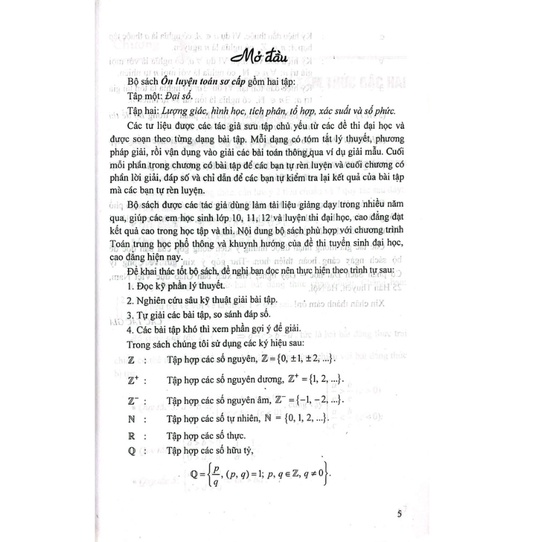 Bộ sách Ôn luyện toán sơ cấp gồm hai tập: Tập một: Đại số. Tập hai: Lượng giác, hình học, tích phân, tổ hợp, xác suất và số phức. Các tư liệu được các tác giả sưu tập chủ yếu từ các đề thi đại học và được soạn theo từng dạng bài tập. Mỗi dạng có tóm tắt lý thuyết, phương lập. Mỗi dạng có tóm tắt lý thuyết, phương pháp giải, rồi vận dụng vào giải các bài toán thông qua ví dụ giải mẫu. Cuối mỗi phần trong chương có bài tập để các bạn tự rèn luyện và cuối chương có phần lời giải, đáp số và chỉ dẫn để các bạn tự kiểm tra lại kết quả của bài tập mà các bạn tự rèn luyện. úng Bộ sách được các tác giả dùng làm tài liệu giảng dạy trong nhiều năm qua, giúp các em học sinh lớp 10, 11, 12 và luyện thi đại học, cao đẳng đạt kết quả cao trong học tập và thi. Nội dung bộ sách phù hợp với chương trình Toán trung học phổ thông và khuynh hướng của đề thi tuyển sinh đại học, cao đẳng hiện nay. Để khai thác tốt bộ sách, đề nghị bạn đọc nên thực hiện theo trình tự sau: 1. Đọc kỹ phần lý thuyết. 2. Nghiên cứu sâu kỹ thuật giải bài tập. 3. Tự giải các bài tập, so sánh đáp số. Tự 4. Các bài tập khó thì xem phần gợi ý để giải.