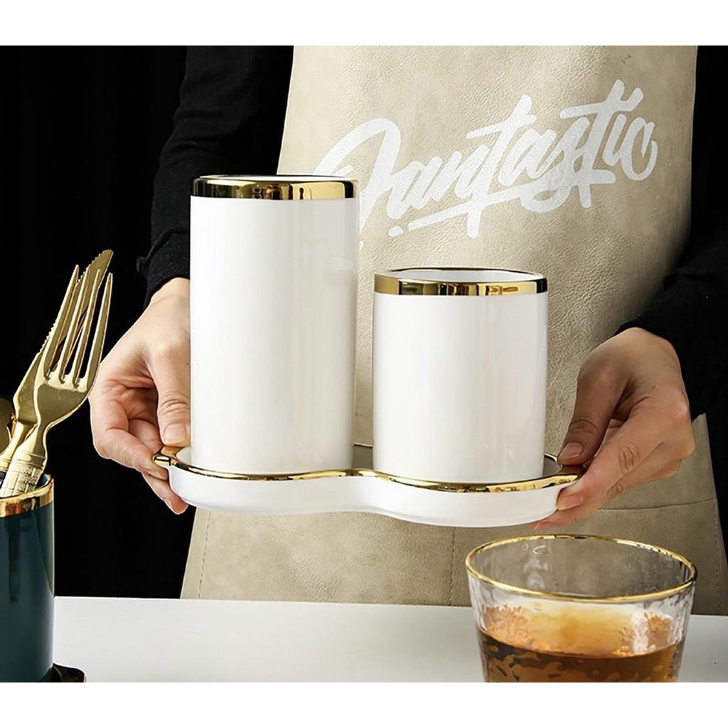 ✨ỐNG ĐỰNG THÌA ĐŨA ĐÔI KHÈM KHAY BẰNG SỨ VIỀN VÀNG PHONG CÁCH BẮC ÂU SANG TRỌNG